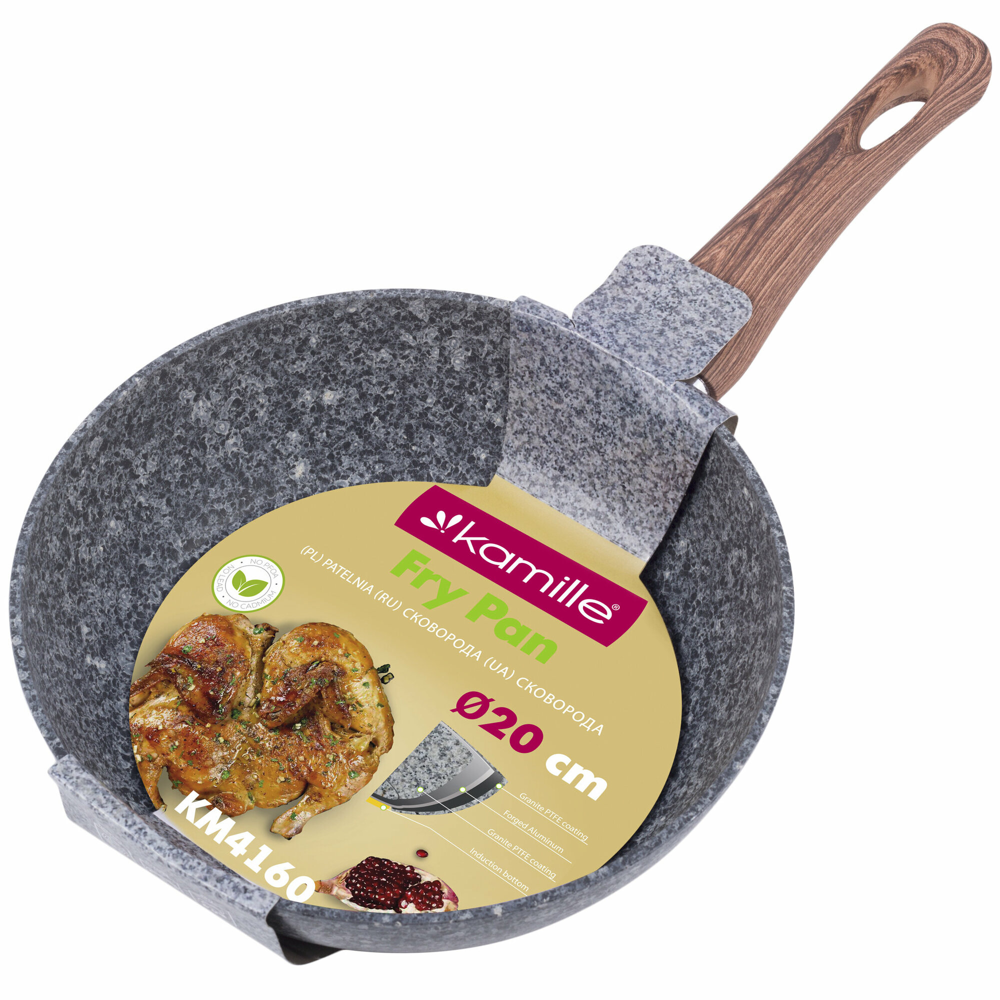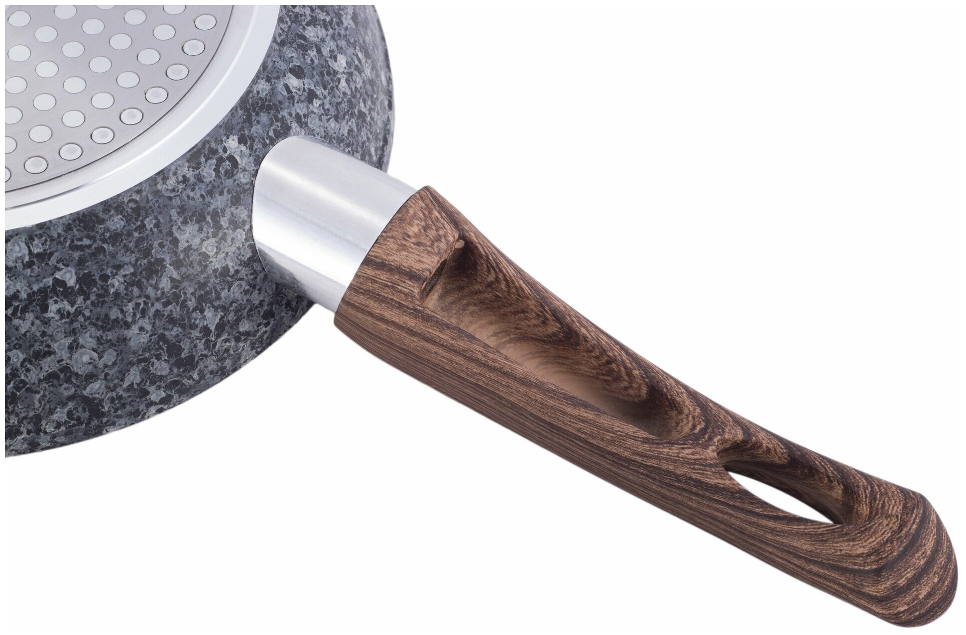 | Дополнительная информация | Длина ручки: 19,5 см. Материал ручки: бакелит с рисунком "дерево" и покрытием "soft-touch". Антипригарное покрытие: серый мрамор. Цвет: серый с коричневой ручкой. |