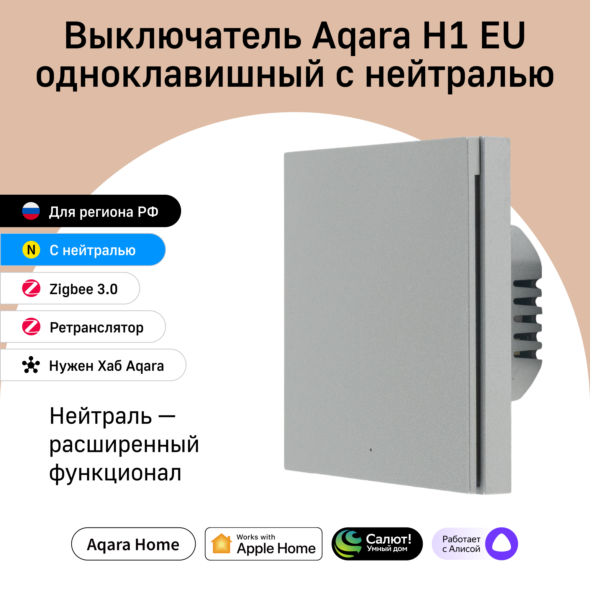 Умный выключатель одноклавишный с нейтралью Aqara H1 WS-EUK03be, умный дом, бежевый