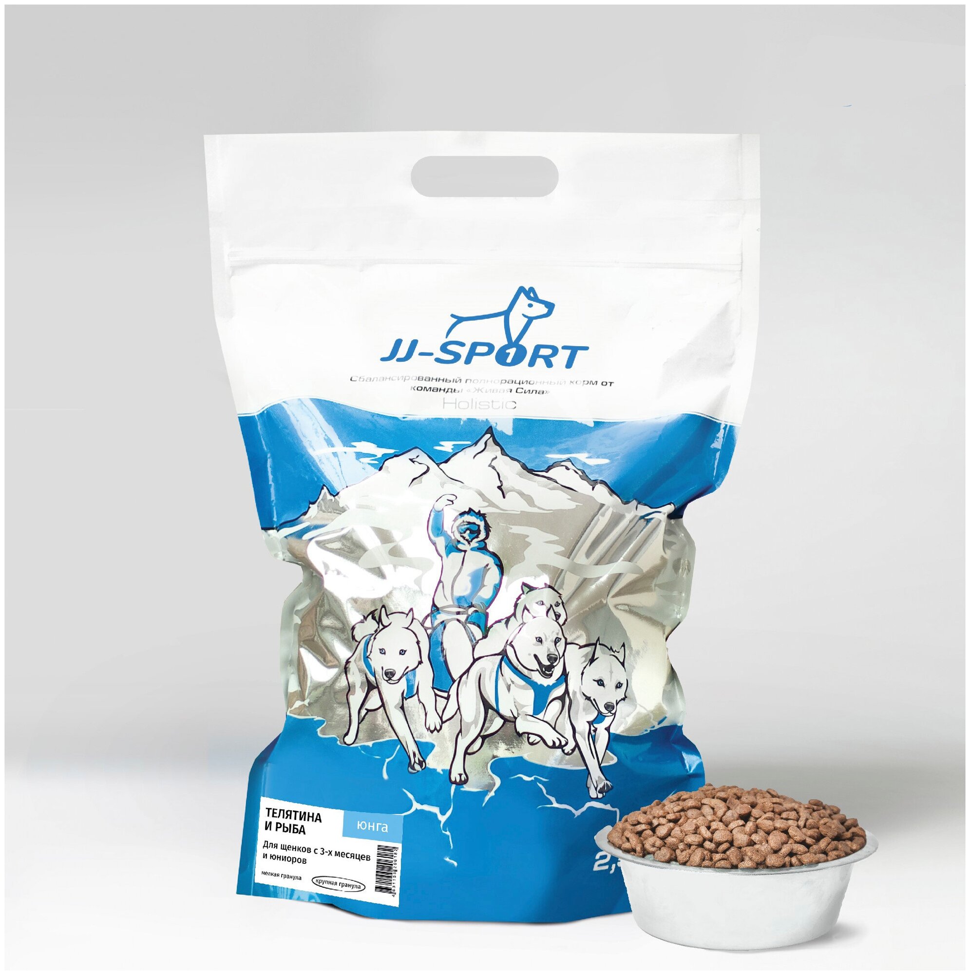 Сухой полнорационный корм JJ-SPORT "Юнга" Живая Сила для щенков с 3 месяцев и юниоров, с телятиной и лососем, крупная гранула 2,5 кг