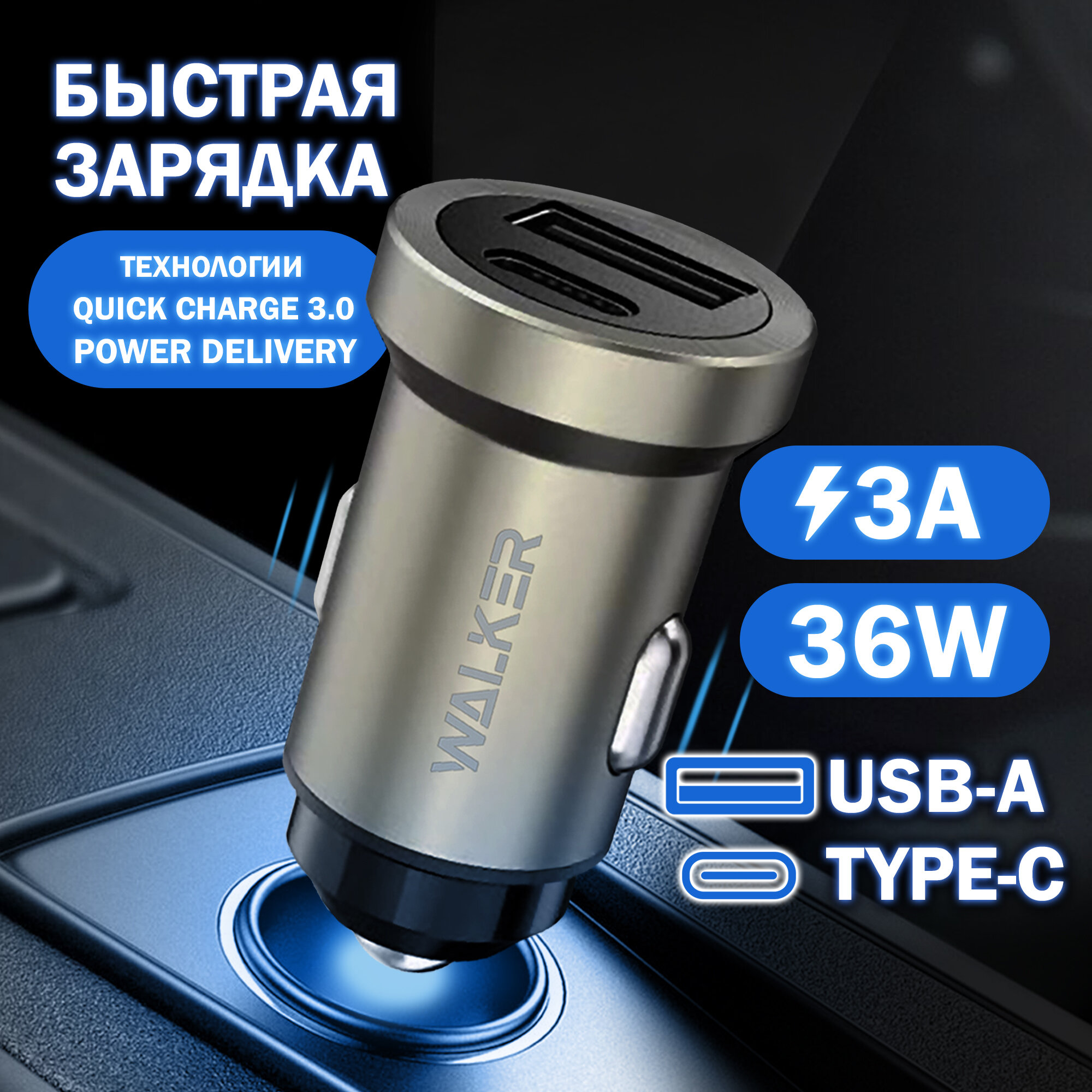 Автомобильная зарядка для гаджетов, WALKER, WCR-25, USB-А Type-C разъемы, 36W, быстрая зарядка, зарядное устройство айфон, андроид, серебряная