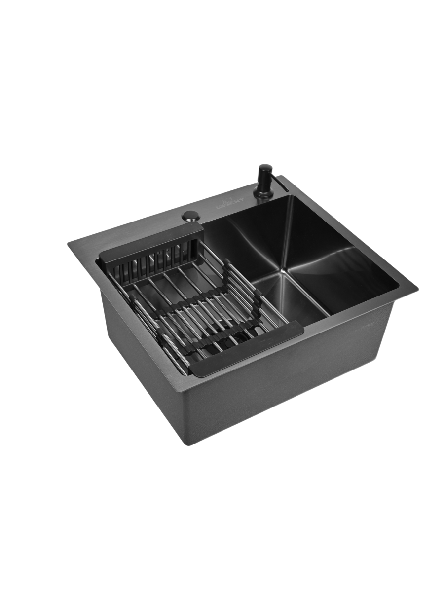 Комплект кухонная мойка из нержавеющей стали WISENT 5044B с PVD покрытием (50х44см) с коландером и дозатором.