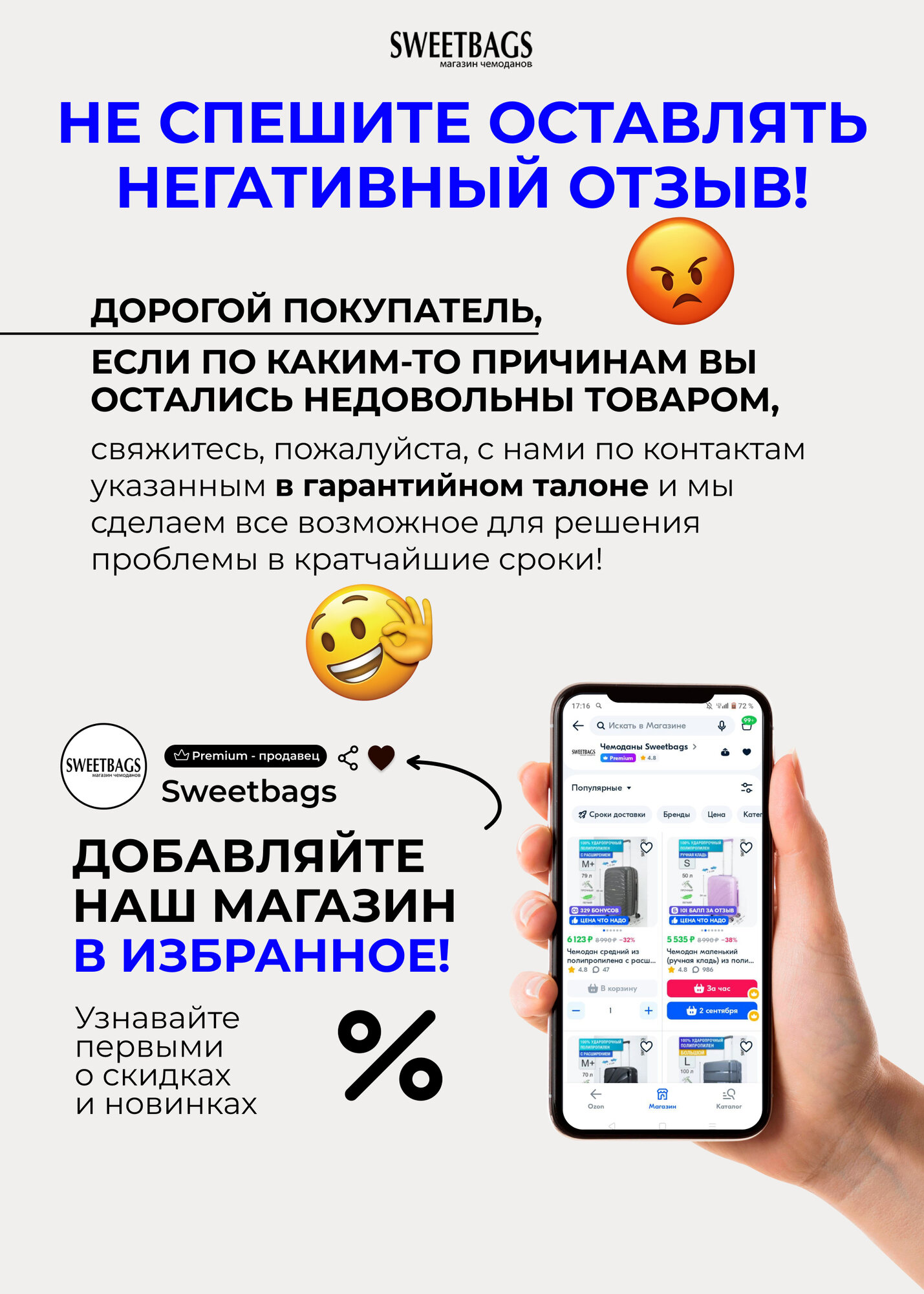 | Плюсы: | Вместительный и удобный, карманы для множества мелочей, откручиваются колёса для удобства в хранении чемодана на полке. |