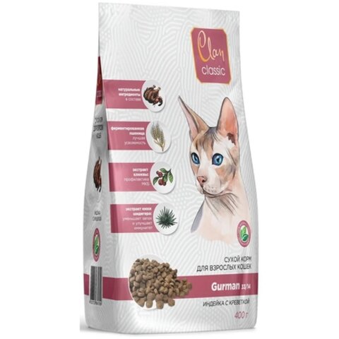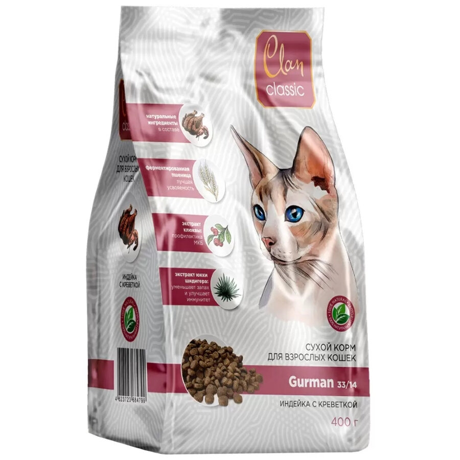 Корм для кошек сухой CLAN Classic Gurman 33/14 для привередливых в еде, индейка и креветки, 400г