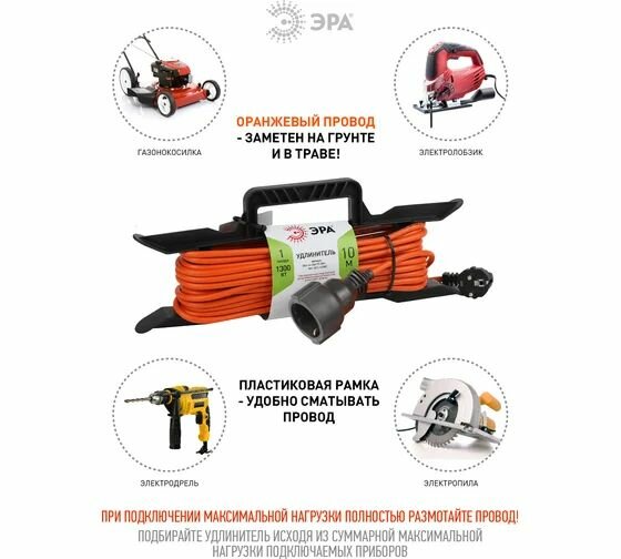 Купить ЭРА Б0046825, 1 розетка, с/з, 6А / 1300 Вт 1 10 м 0.75 м² оранжевый