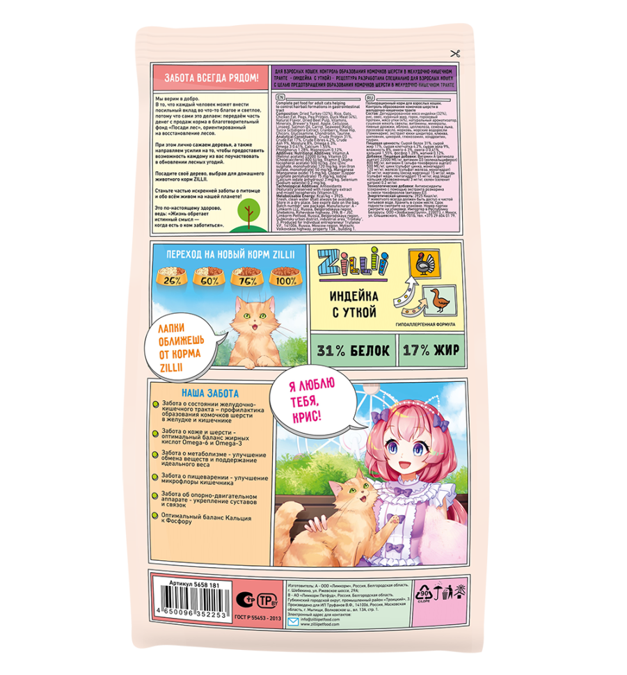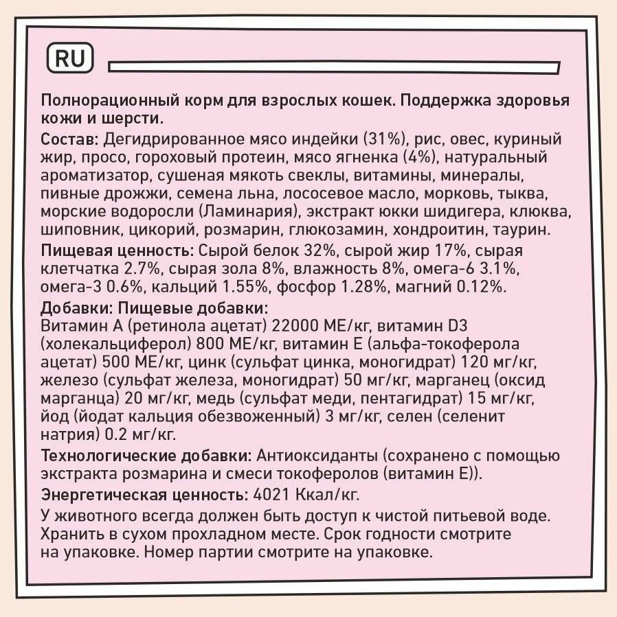Как бонус, удобная упаковка с зип замком и очень милый дизайн. Пакета 2 кг нам хватает месяца на два. Какого-то супер влияния на шерсть я не заметила, но хуже точно не стало и кошка есть охотно. Проблем с пищеварением и аллергии ни разу не было в течении года. |