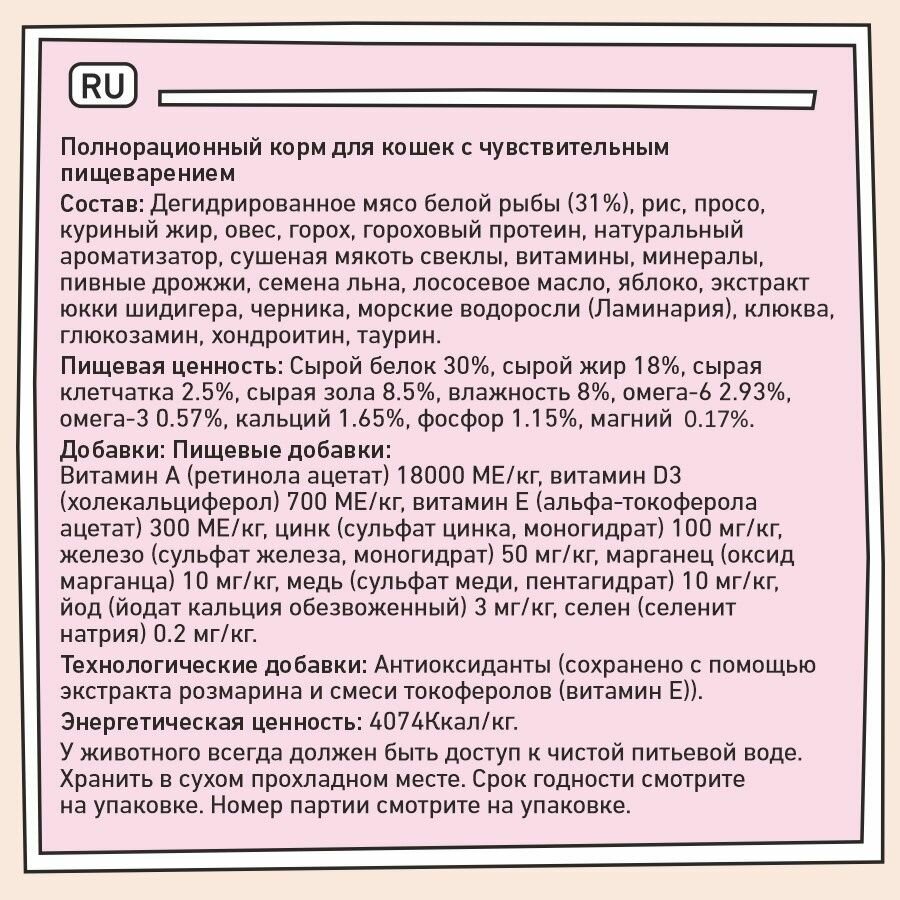 ZILLII Sensitive Digestion Cat Сухой корм для кошек с чувствительным пищеварением, Белая Рыба 10кг