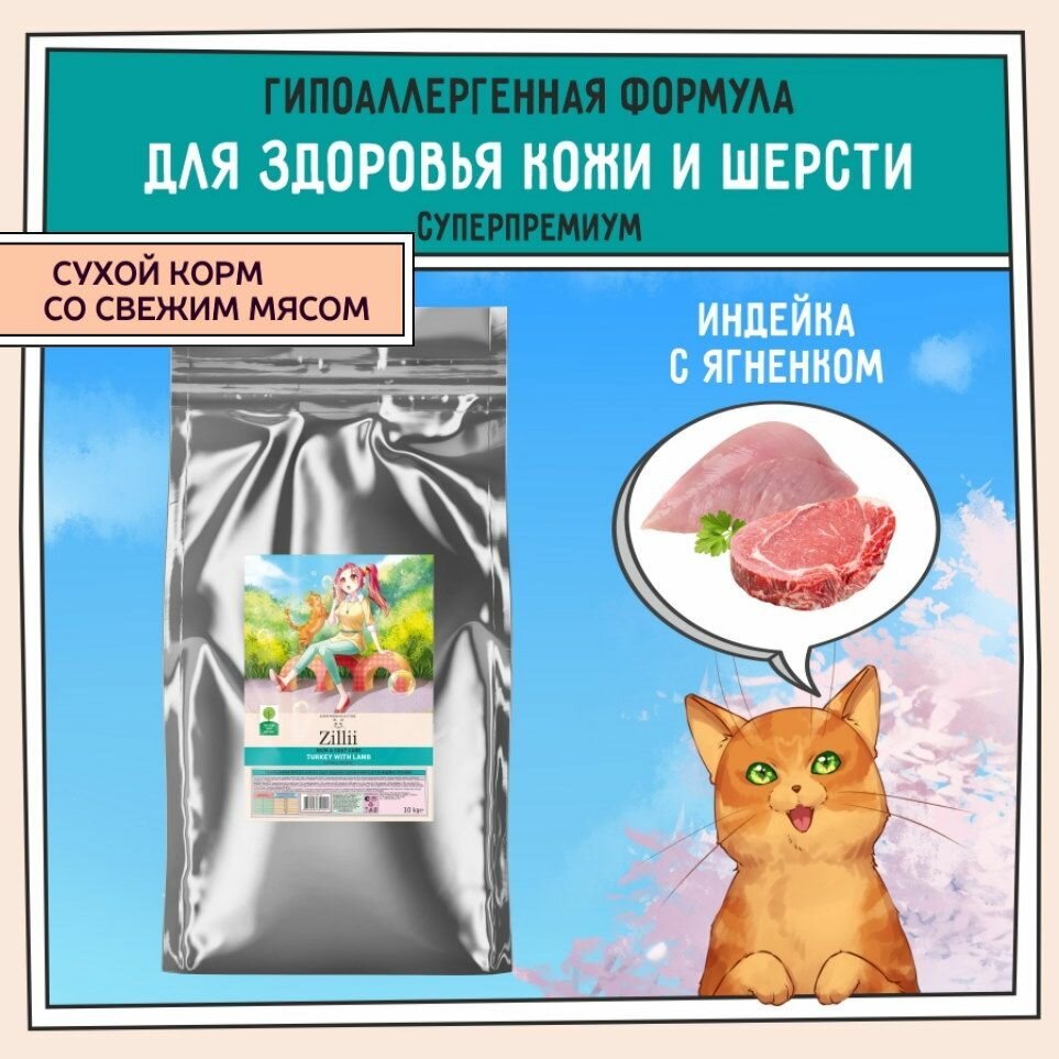 Корм сухой для кошек поддержка здоровья кожи и шерсти, гипоаллергенный ZILLII (Зиллии), 10 кг Индейка с Ягнёнком