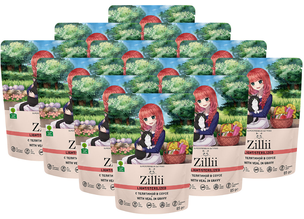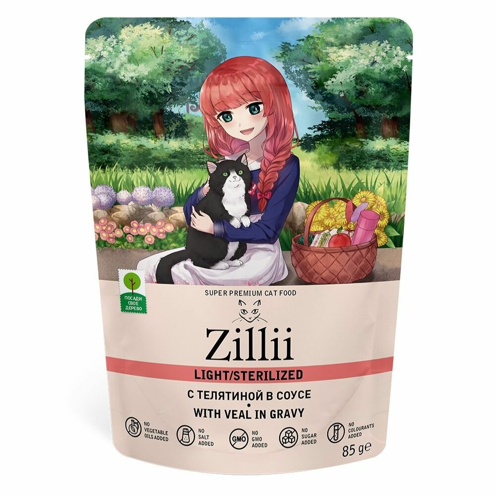 Zillii Sterilized/Light Cat Veal влажный корм для взрослых стерилизованных кошек с телятиной в соусе, в паучах - 85 г х 12 шт