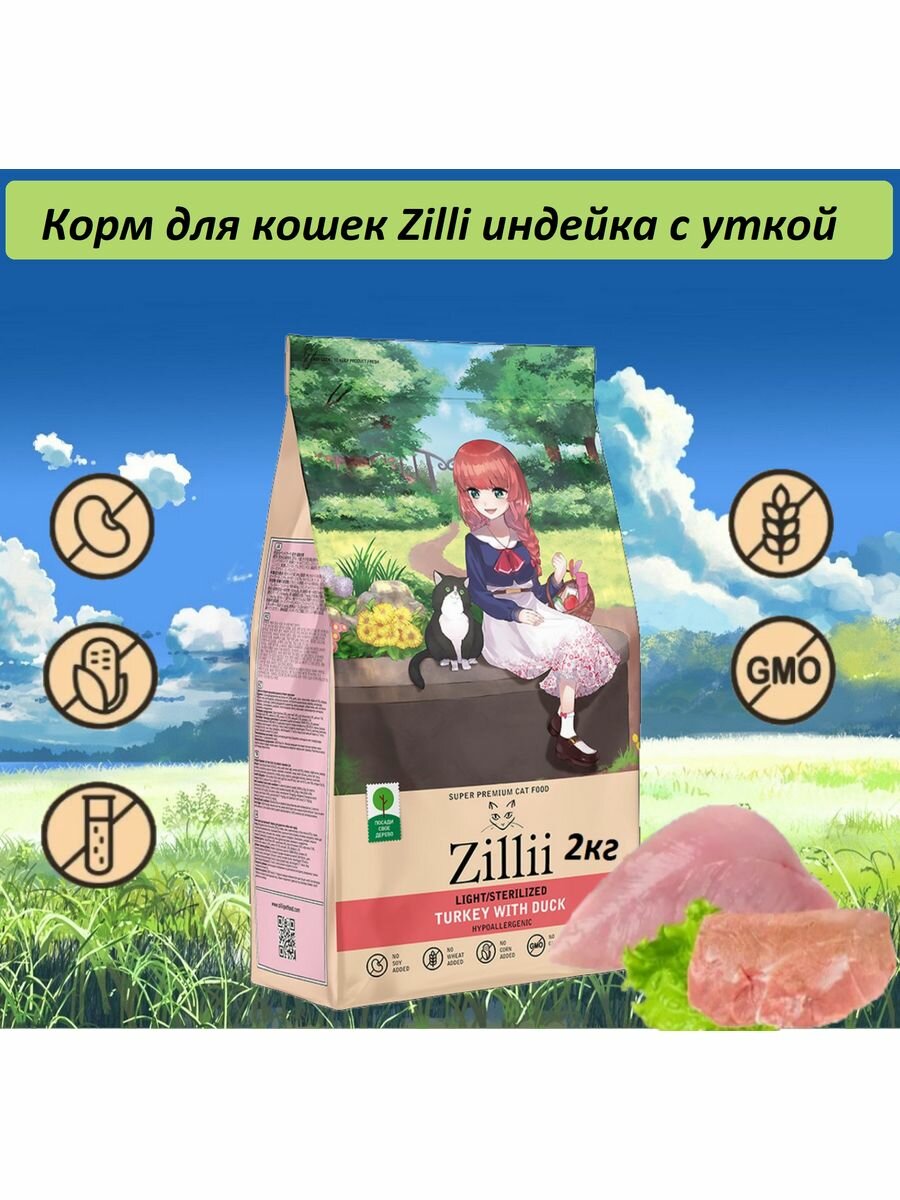 Сухой корм для кошек стерилизованных и с избыточным весом 2 кг, гипоаллергенный ZILLII (Зилли), Индейка с Ягнёнком