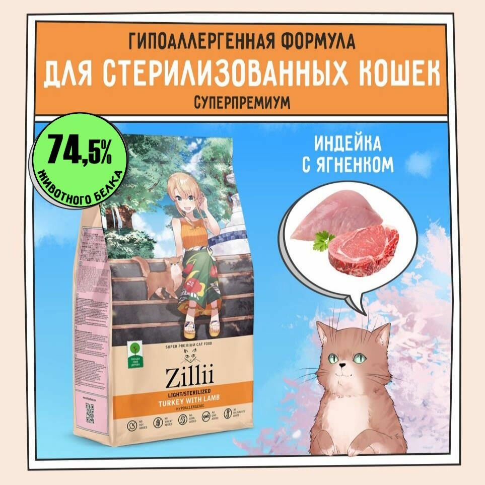 ZILLII Light/Sterilized Cat Сухой корм для кошек с избыточным весом и стерилизованных Индейка/Ягнёнок 2кг