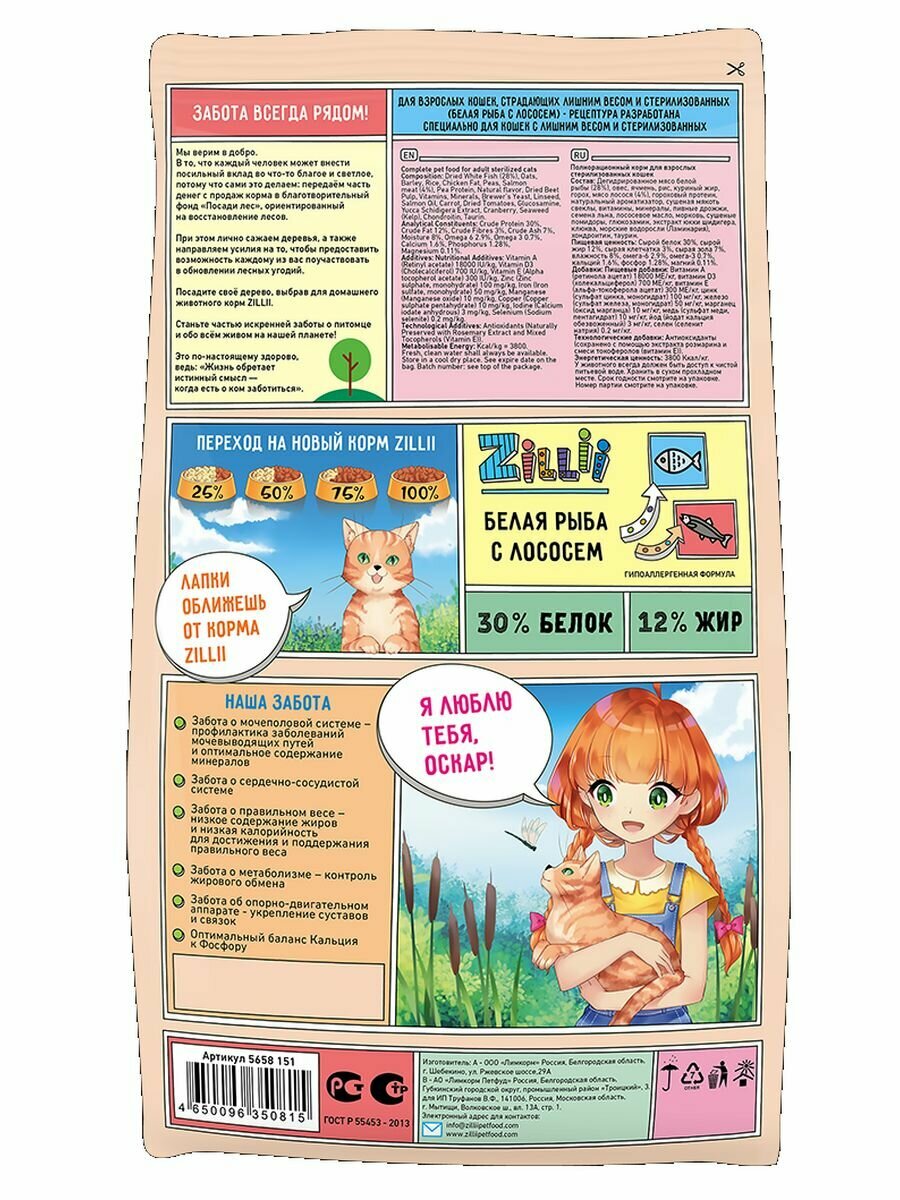 СохранитьСухой корм для кошек стерилизованных и с избыточным весом 400 г, гипоаллергенный ZILLII (Зилли), Белая Рыба с Лососем интересное: