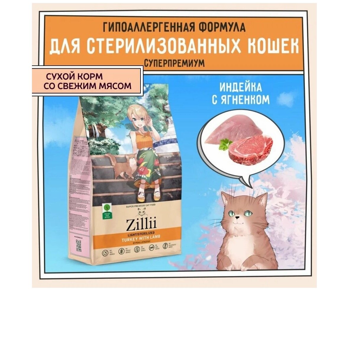 Zillii Light and Sterilized Cat для взрослых стрерилизованных и склонных к полноте кошек Индейка с Ягнёнком 2кг
