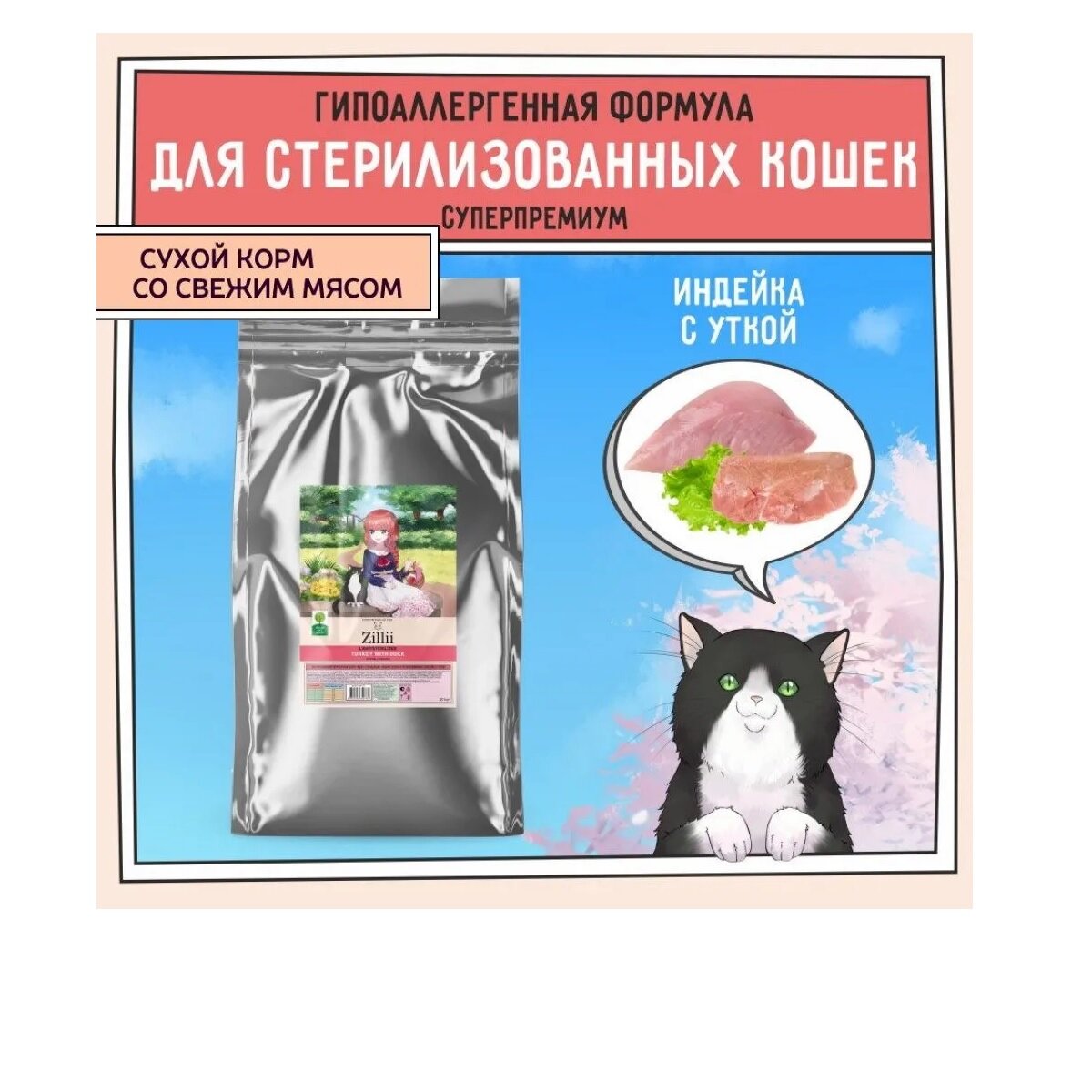 Сухой корм для стерилизованных кошек и кастрированных котов 2 кг, гипоаллергенный ZILLII (Зилли), Индейка с Ягнёнком