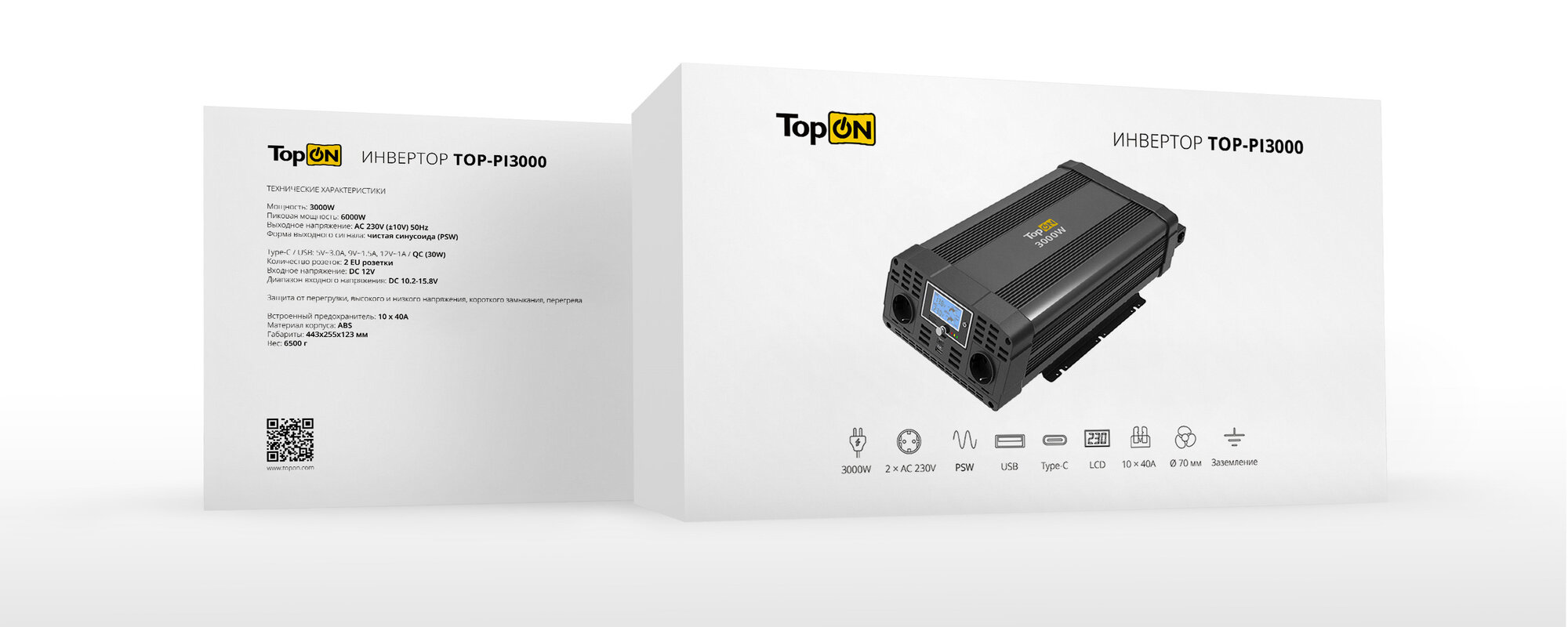 | Комплектация | Автомобильный инвертор TopON TOP-PI3000 3000W 2 розетки, чистый синус, Type-C PD, USB QC, LCD экран, пиковая мощность 6000W Черный |