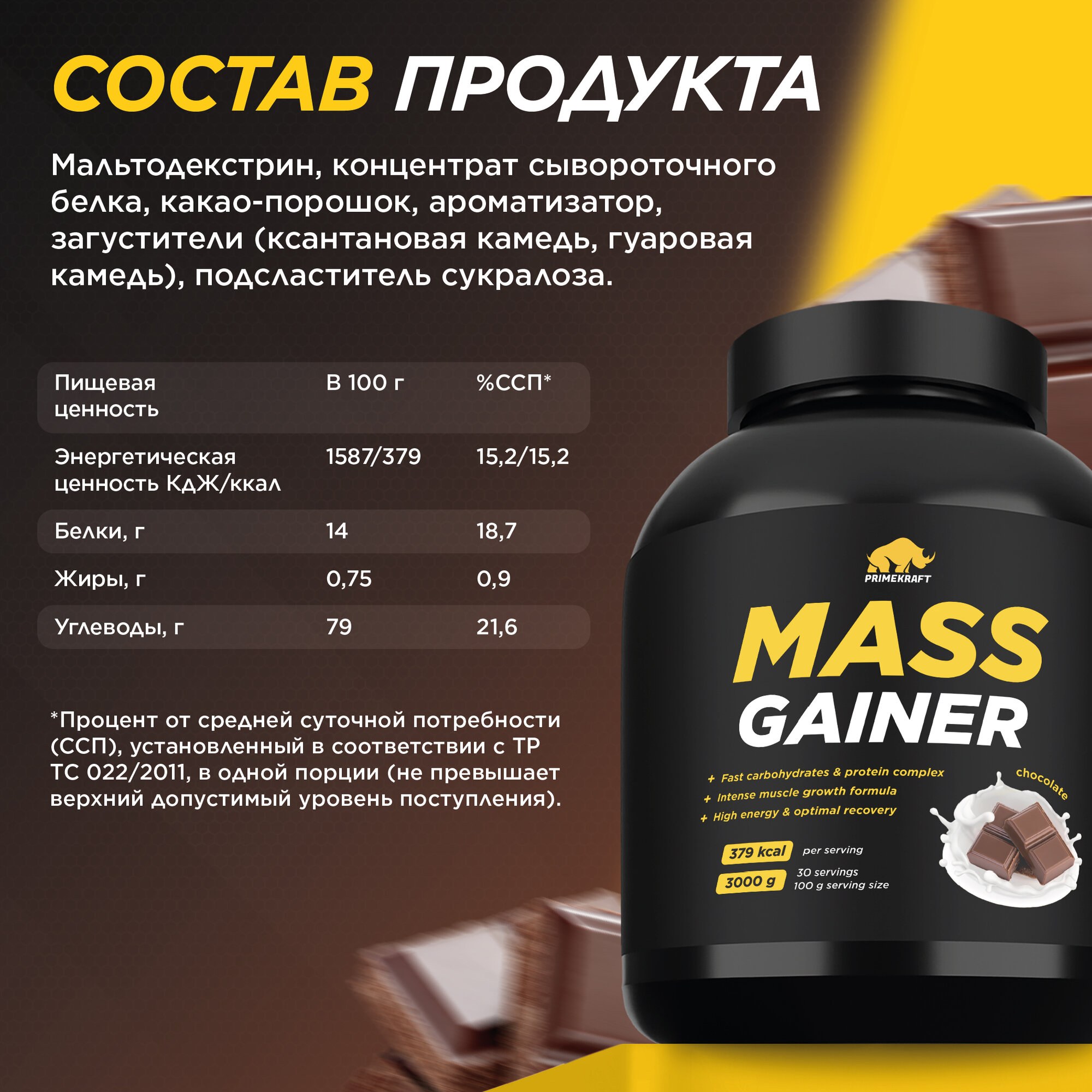 Гейнер белково-углеводный PRIMEKRAFT/ MASS GAINER для набора массы со вкусом "Шоколад" 1000 гр