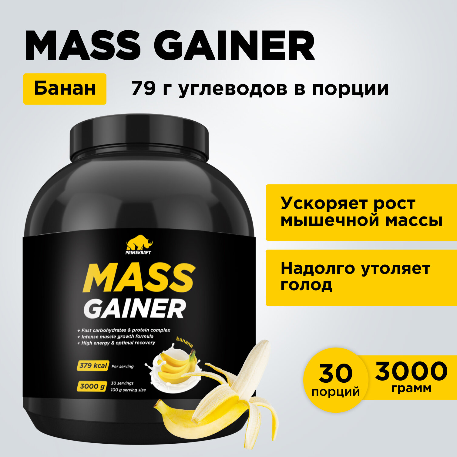 Гейнер белково-углеводный PRIMEKRAFT/ MASS GAINER для набора массы со вкусом «Банан», 3 кг, банка