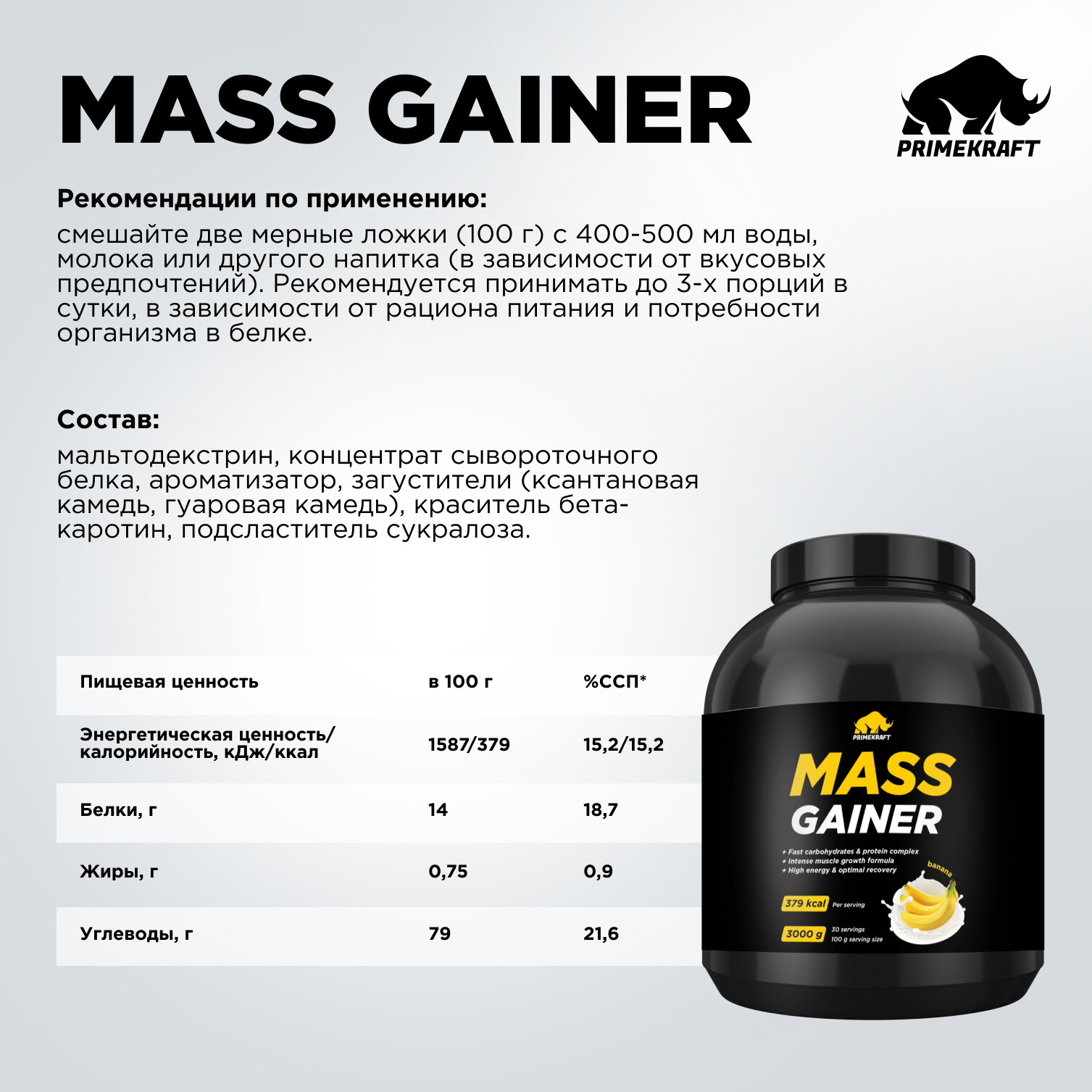 Купить Гейнер белково-углеводный Prime Kraft MASS GAINER для набора массы - Банан банка 3000 гр