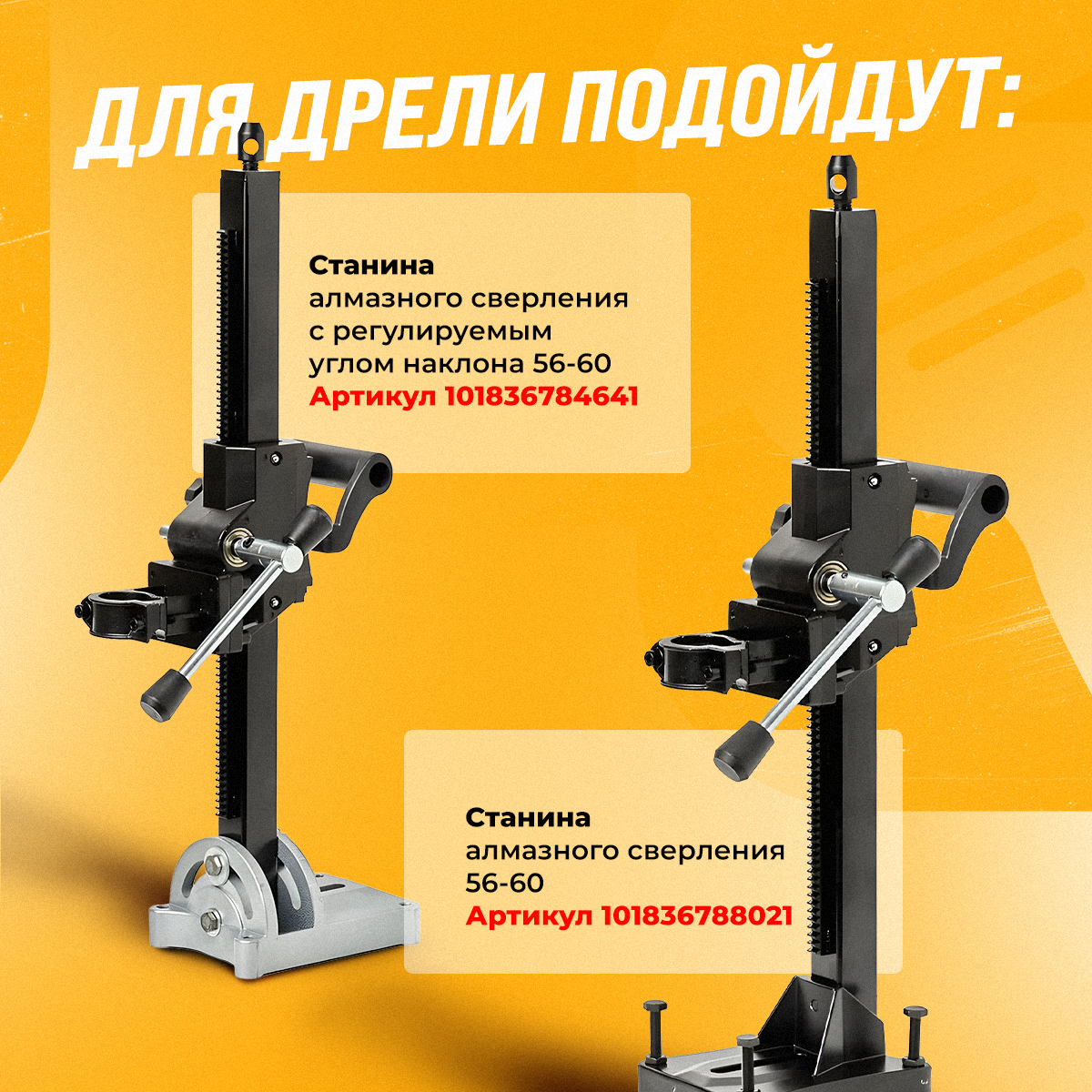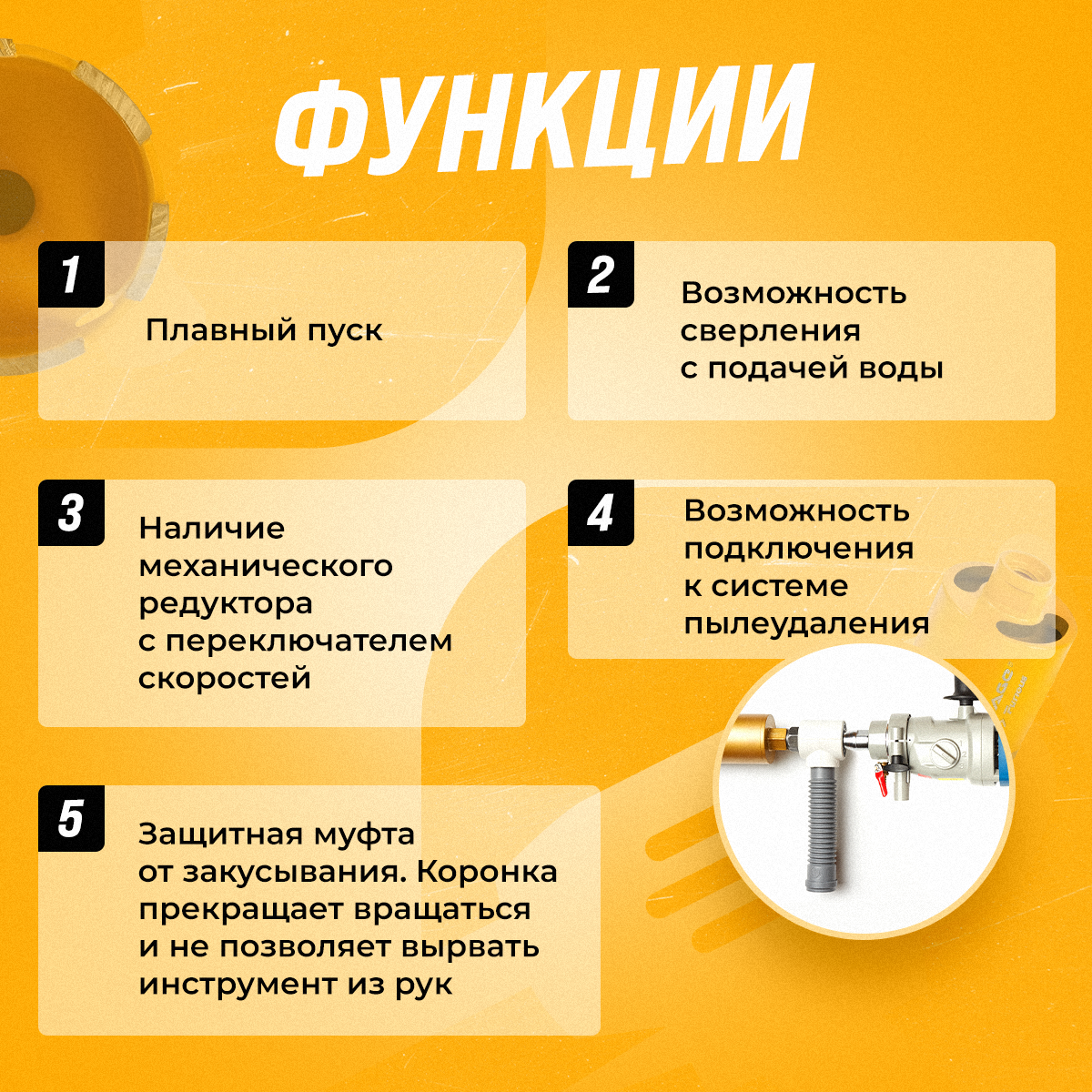 | Подробная комплектация | Дрель, рукоять, упор, кейс, ключ, система подключения воды |