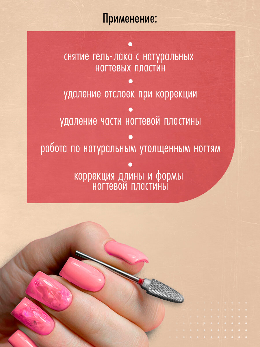 | Плюсы: | Отличная фреза,хорошо снимает покрытие,не портя ноготь |