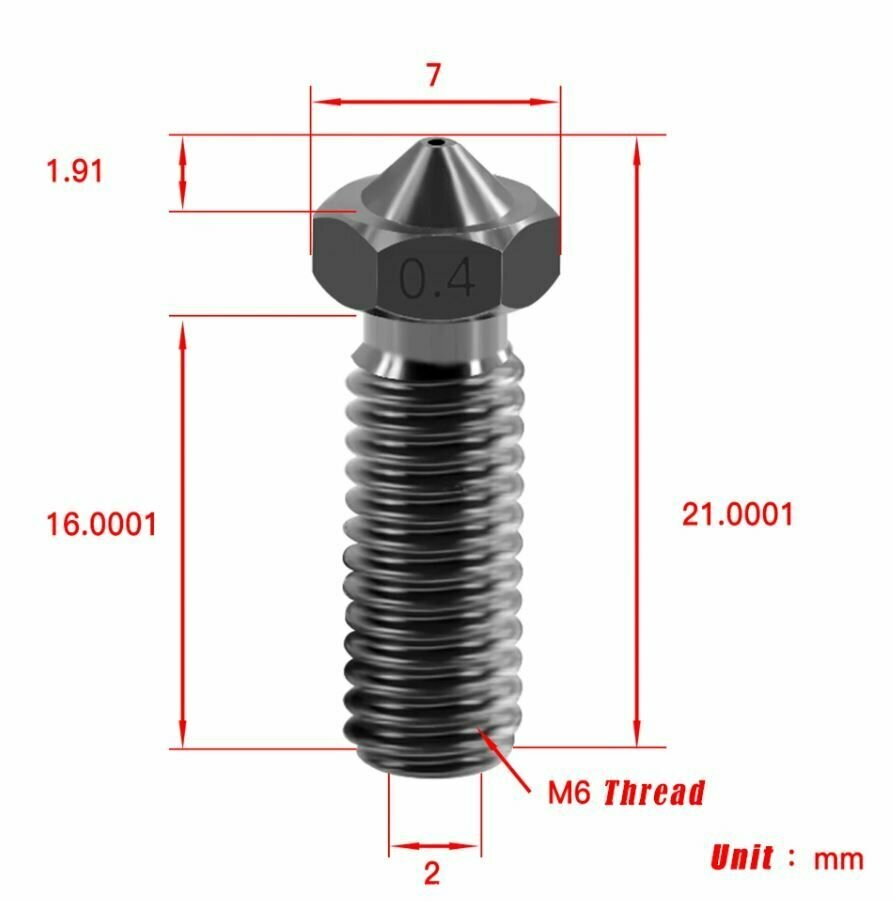 Volcano E3D V6 Сопло закаленная сталь для 3D принтера 0.4мм для нити 1.75мм