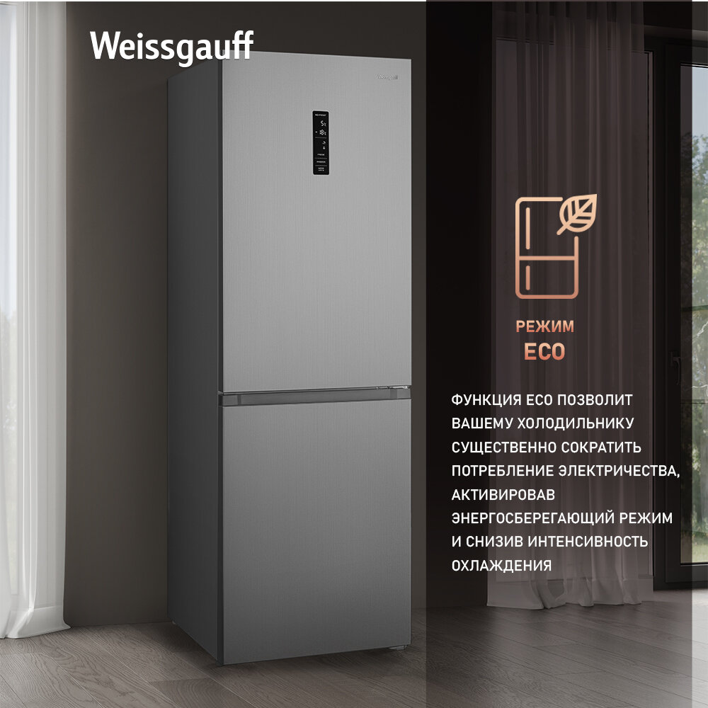Купить Отдельностоящий холодильник с инвертором Weissgauff WRK 185 Total NoFrost Inverter Inox двухкамерный шириной 60 см, 3 года гарантии, Тихий 40 дБ, Дисплей, Сенсорное управление, Зона свежести, Супер заморозка 15 кг сутки, Перенавешиваемая дверь