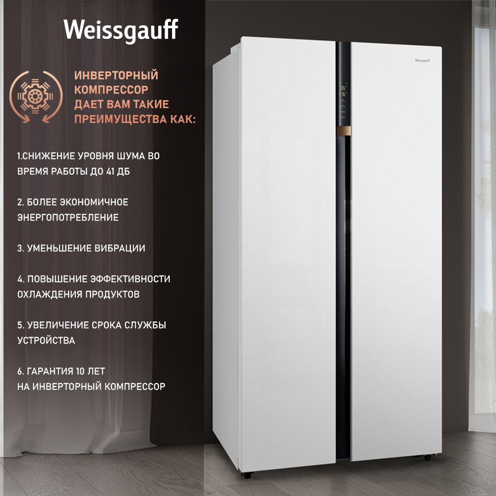 Купить Холодильник Weissgauff WSBS 590 WG NoFrost Inverter Premium, белое закаленное стекло Side by Side двухдверный, 3 года гарантии, Мощность замораживания 12 кг сутки , Сенсорное управление, Цифровой дисплей, Ионизация, Зона свежести, Суперзаморозка, A+