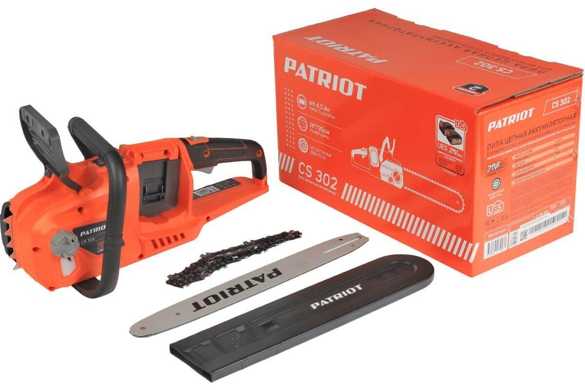 пила цепная аккумуляторная patriot cs 302 2*21в ues без акб и зубесщеточ 14"35см 38" 13мм 52зв ean:4630065970961