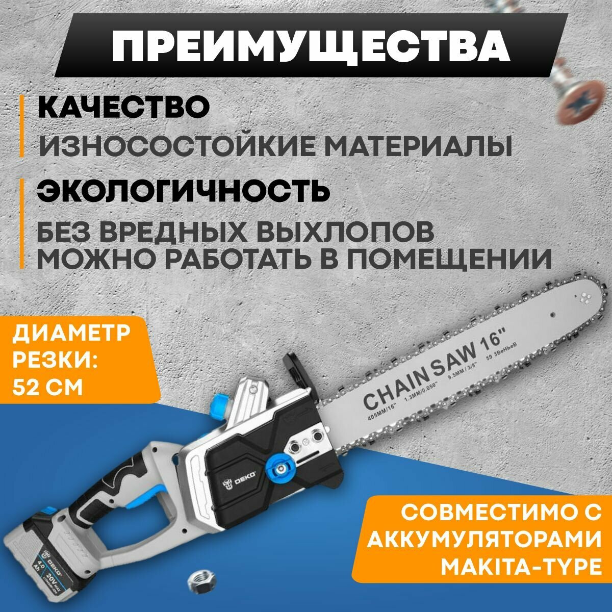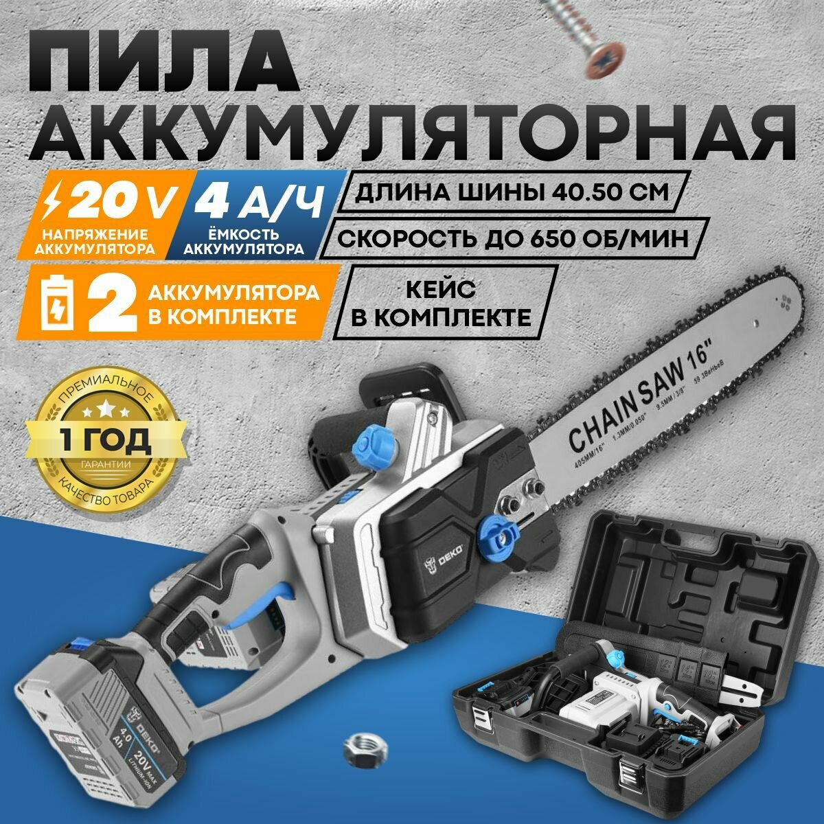 Цепная пила DEKO DKCHS 40 PRO, аккумуляторная, 20В, 4Ач [063-4357]