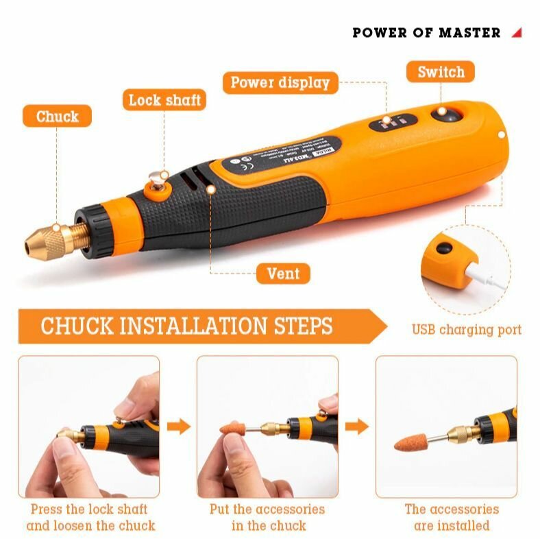 | Комплектация | 1. Гравер - 1шт. 2. Зарядный кабель - 1шт. 3. Набор насадок и паст - 46шт. 4. Инструкция |