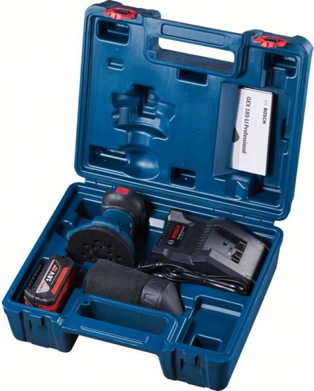 | Комплектация | Шлифмашина GEX 185-Li 06013A5020, 1 пылесборный мешок , 1 аккумуляторная батарея GBA 18V 4.0Ah, Быстрозарядное устройство GAL 18V-40 Professional, Кейс |