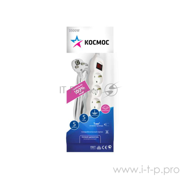 Сетевой фильтр Космос YKsm5m-3g-Z-V K 5м белый 3 гнезда 3х1 .