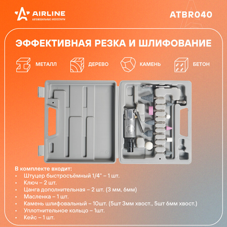 Купить Машинка шлифовальная пневматическая 120мм, 25000 об/мин прямая с оснасткой 16 пр. кейс ATBR040 AIRLINE