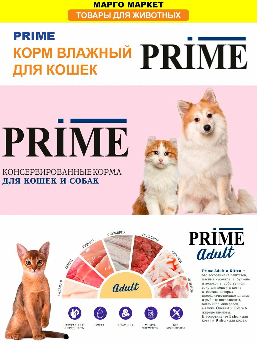PRIME MEAT ADULT CAT для взрослых кошек с тунцом и кальмаром в собственном соку (70 гр х 24 шт)