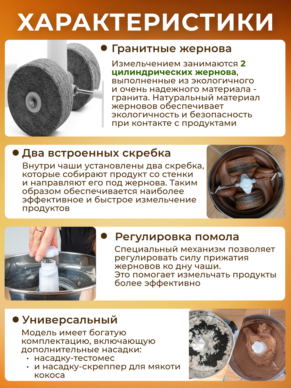 | Дополнительная информация | гранитные жернова, поворотная чаша, защитами от перегрева и перегрузок, время непрерывной работы - 24ч, количество оборотов в минуту - 80 |