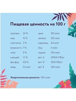 | Минеральные вещества | Цинк 150 мг/кг, железо 100 мг/кг, марганец 40 мг/кг, йод 4 мг/кг, таурин 100 мг/кг |