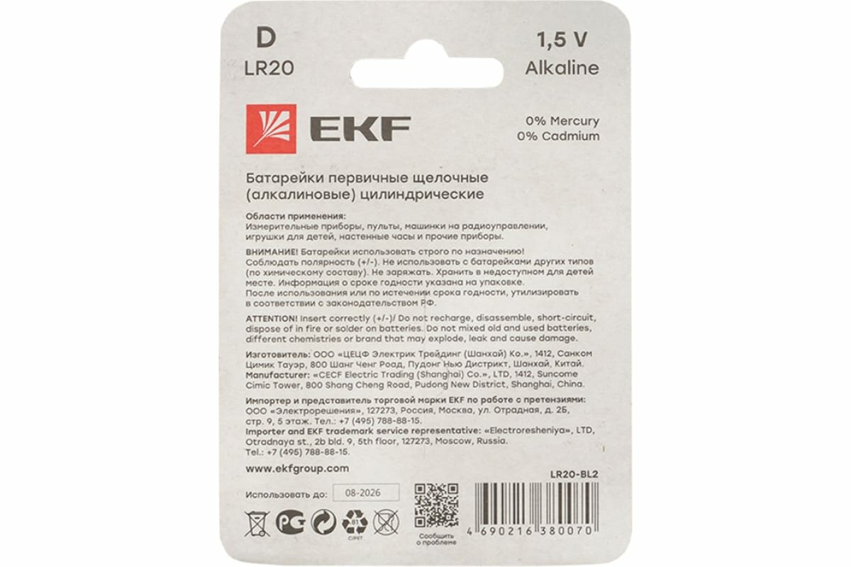 Элемент питания алкалиновый EKF, тип D, LR20, 1,5 В, 2 шт интересное: