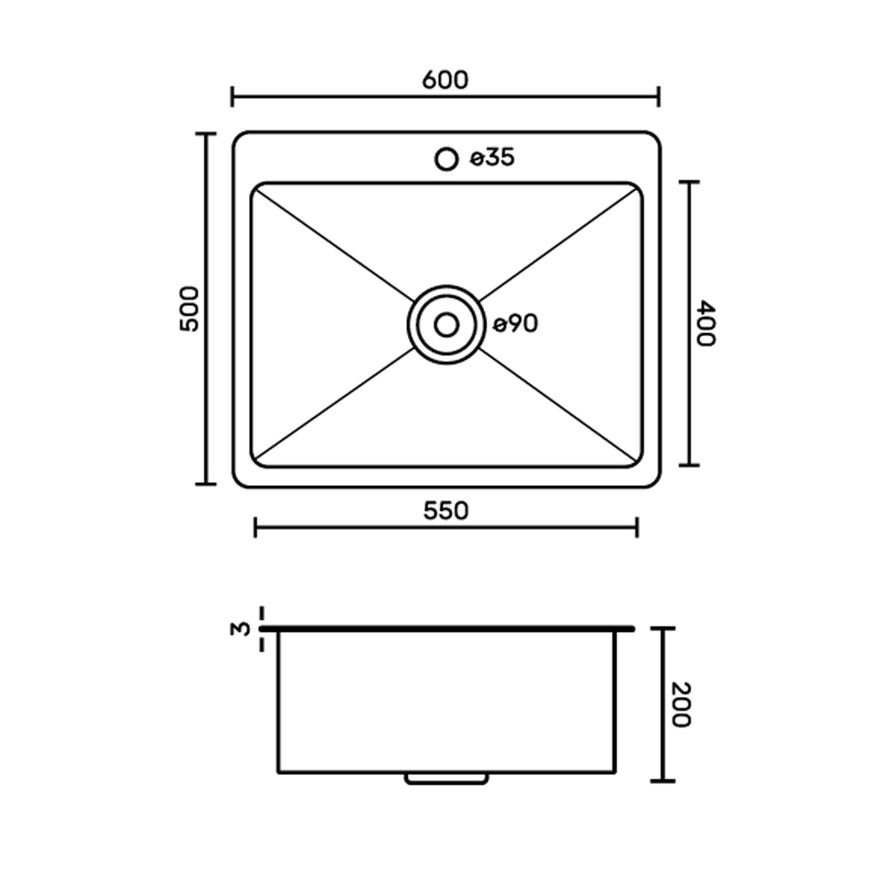 Мойка врезная 60х50 см, графит, дизайн толщина 3,0 х 1 мм,