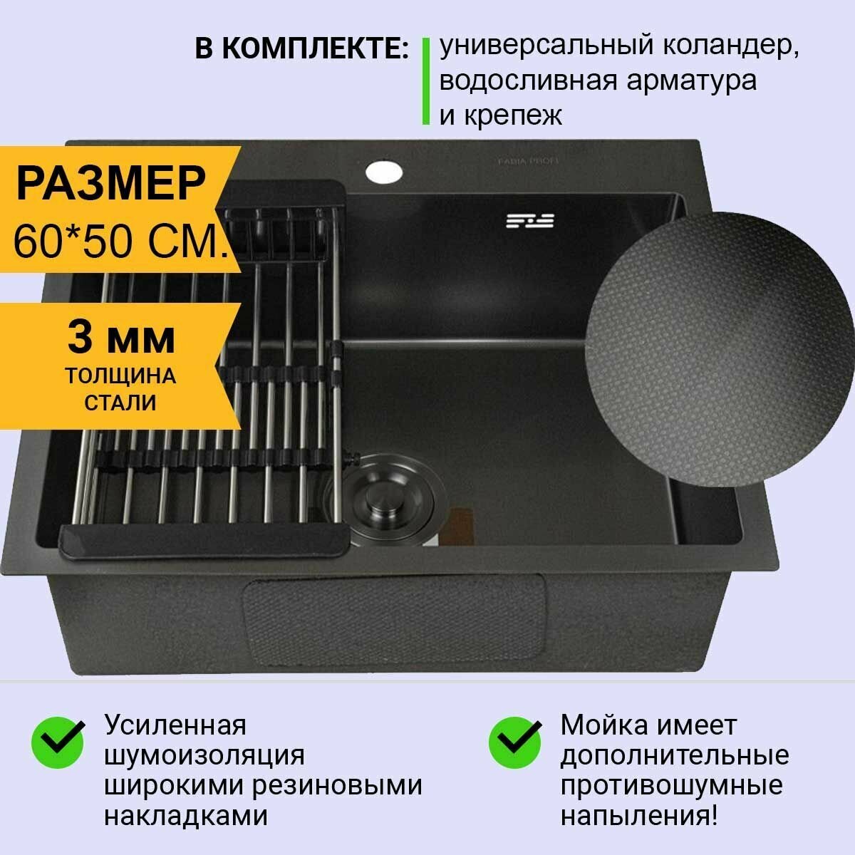 Fabia profi 60503dg мойка врезная 60х50 см графит, декор, толщина 3,0х0,8 мм, глубина 200 мм+большой сифон с переливом+корзина мойка врезная
