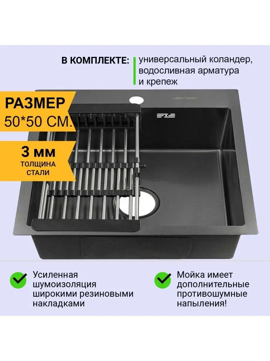 Мойка нержавеющая врезная 50х50 графит FABIA Profi (3.0х200) выпуск 3 1/2 с сифоном, с коландером