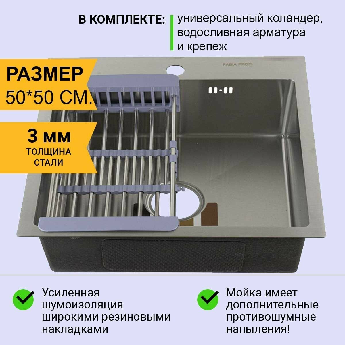 Мойка нержавеющая врезная 50х50 графит FABIA Profi (3.0х200) выпуск 3 1/2 с сифоном, с коландером