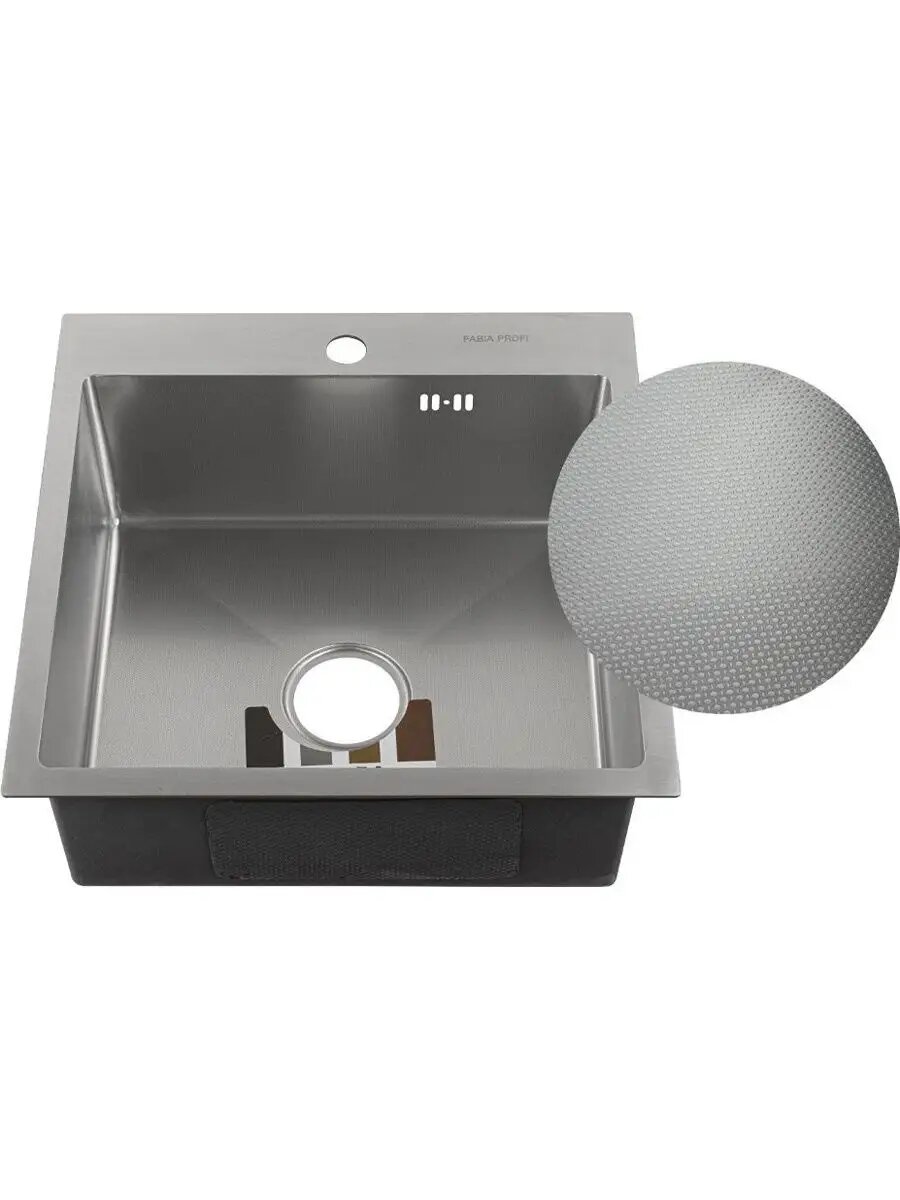 FABIA PROFI - Мойка врезная 50х50 см, декор, толщина 3,0 х 0,8 мм, глубина 200 мм + большой сифон с переливом + корзина