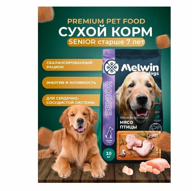 Купить Корм сухой Melwin для собак старше 7 лет, с мясом птицы, 10 кг