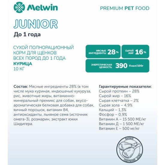 Купить Сухой корм Melwin для щенков до 1 года курица 10 кг