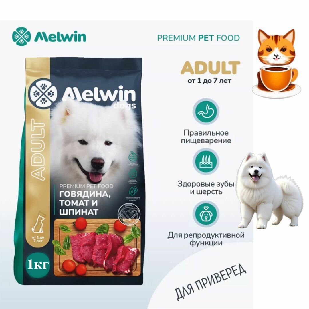 Сухой корм Melwin для взрослых собак, с говядиной, томатами и шпинатом, 1 кг