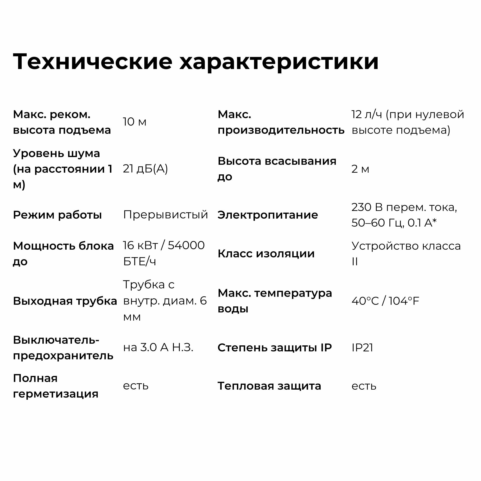 | Подробная комплектация | насос Mini Orange, съемный кабель электропитания длиной 1.5 м, резервуар, крышка резервуара с кабелем датчика длиной 1.5 м, погружной резервуар, антисифонное устройство, поплавок и фильтр, трубка длиной 1.5 м с внутренним диаметром 6 мм, оранжевая входная трубка длиной 220 мм с внутренним диаметром 14 мм, виниловая трубка для забора воздуха длиной 150 мм с внутренним диаметром 6 мм, комплект для соединения, комплект аксессуаров для монтажа, инструкция по установке |
