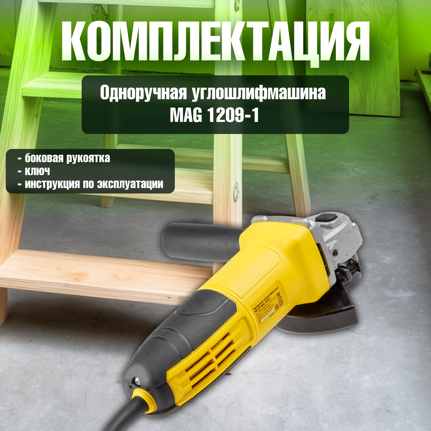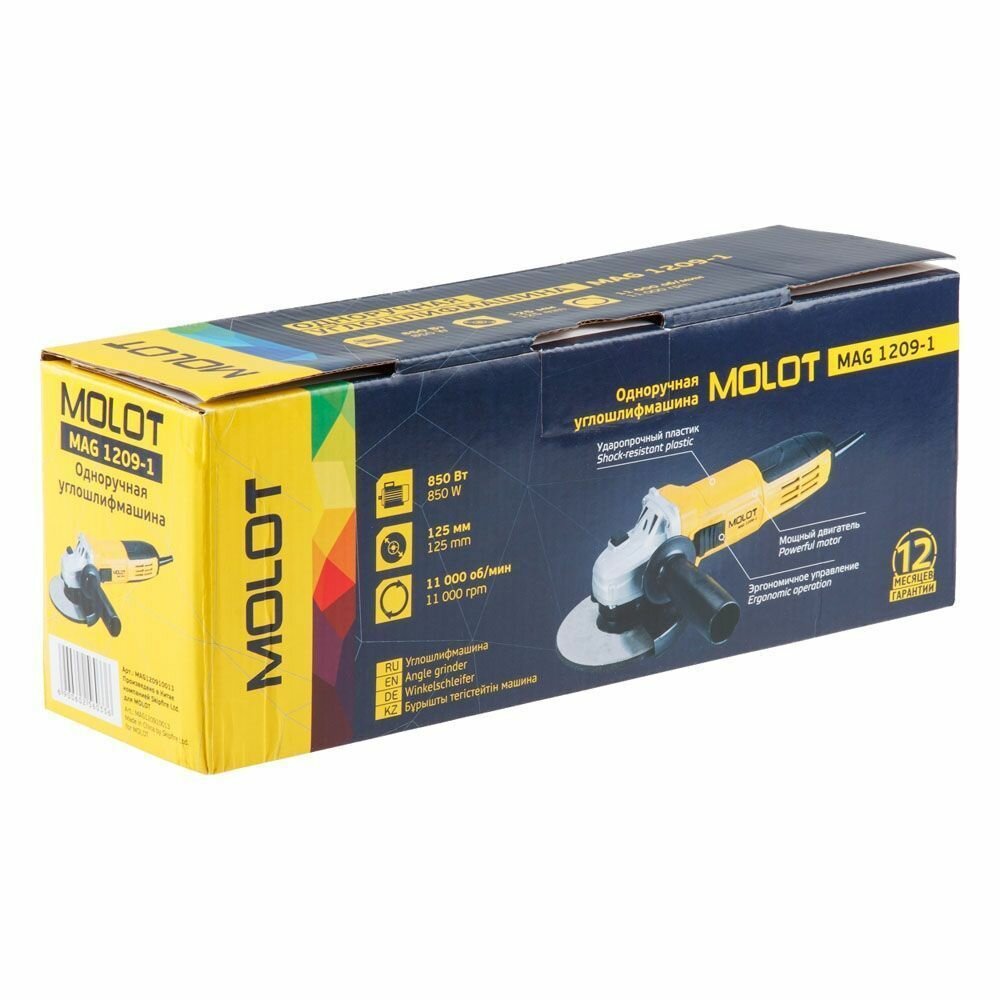 Болгарка, Одноручная углошлифмашина MOLOT MAG 1209-1 (850 Вт, диск 125х22 мм, 11000 об/мин, бронированный ротор, игольчатый подшипник)