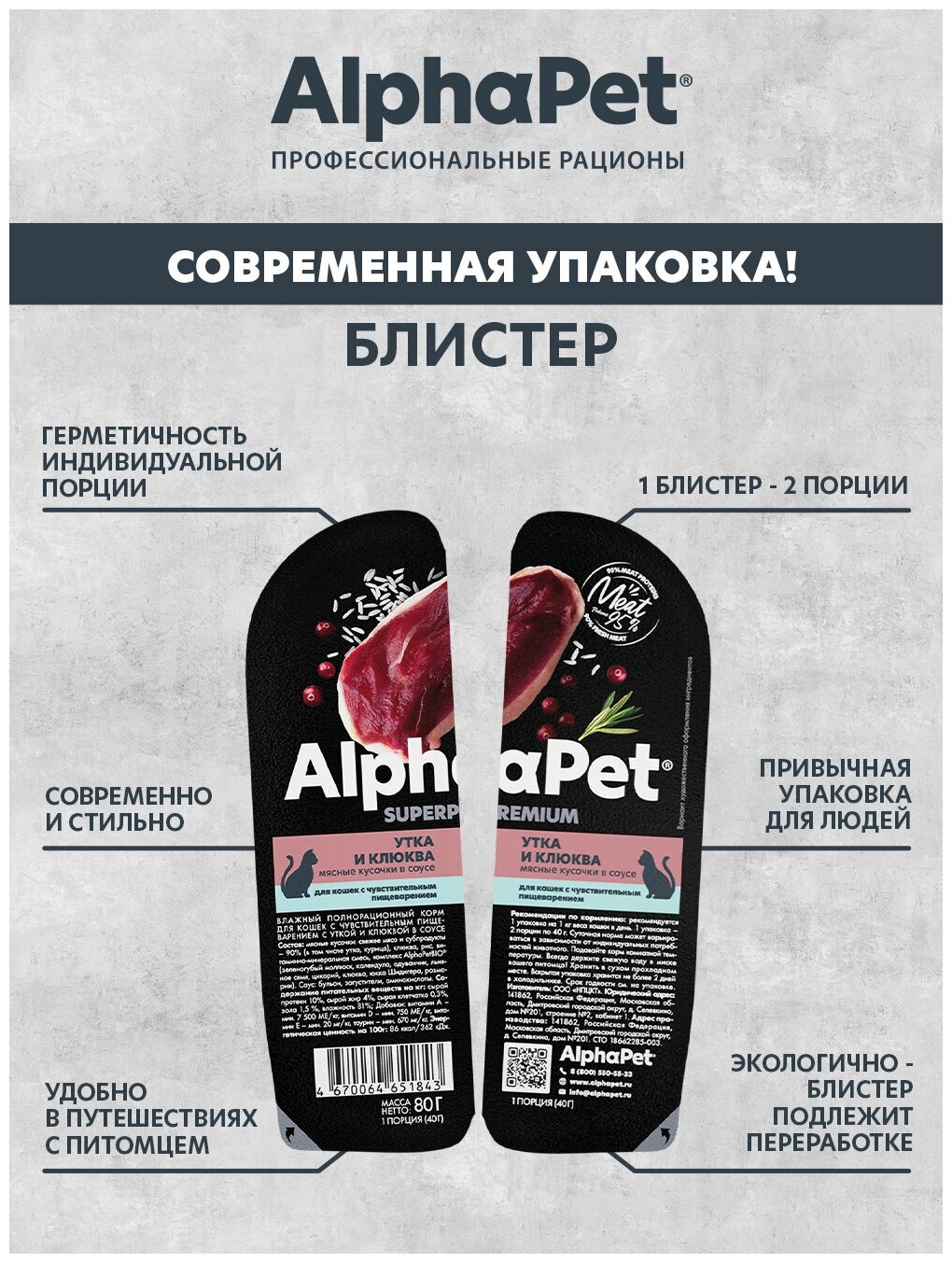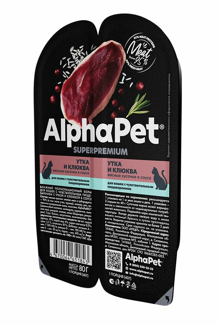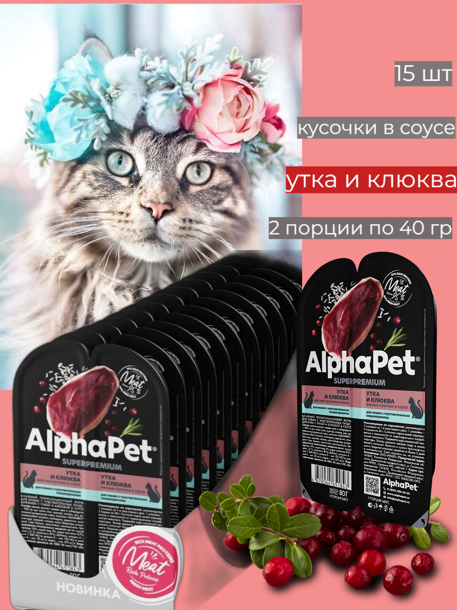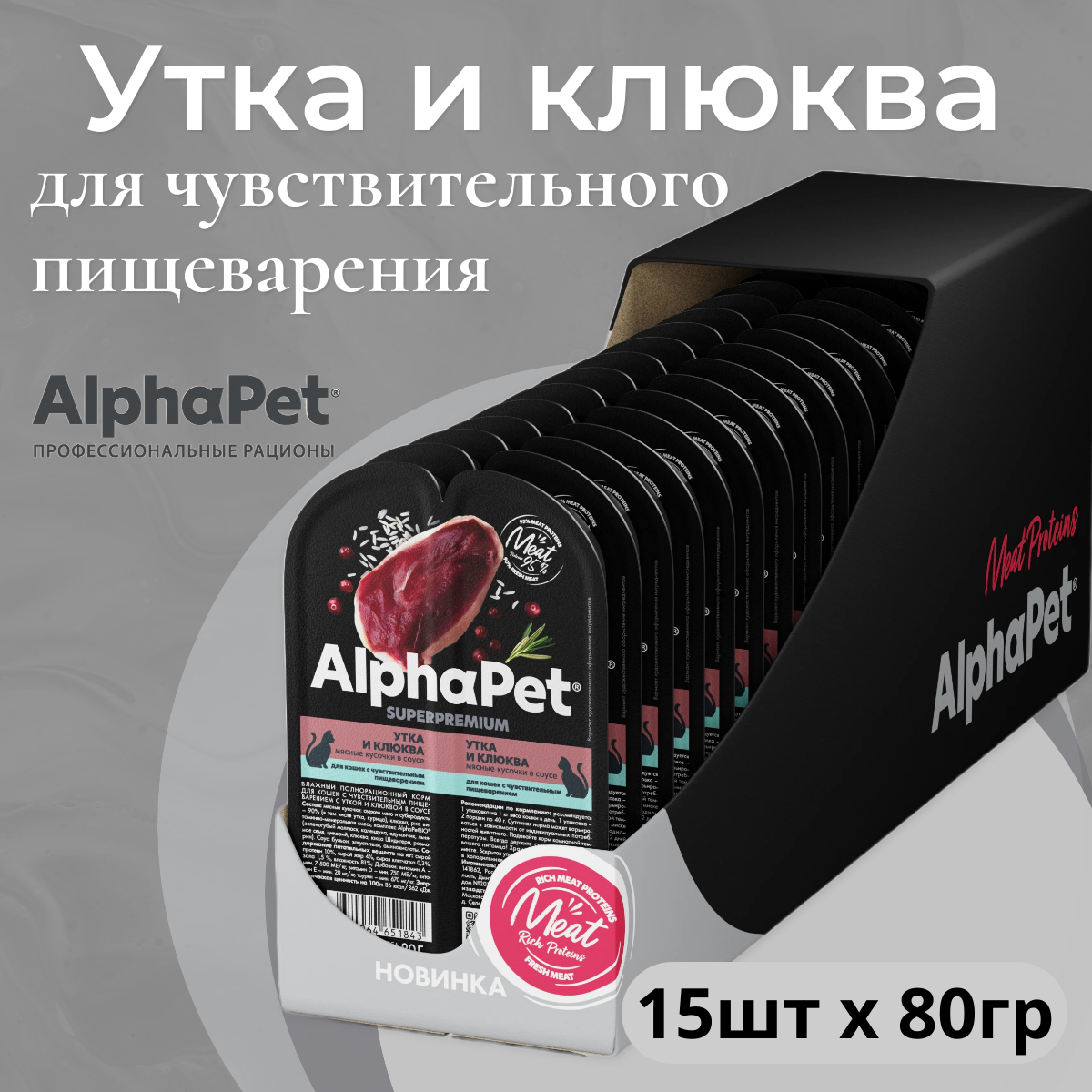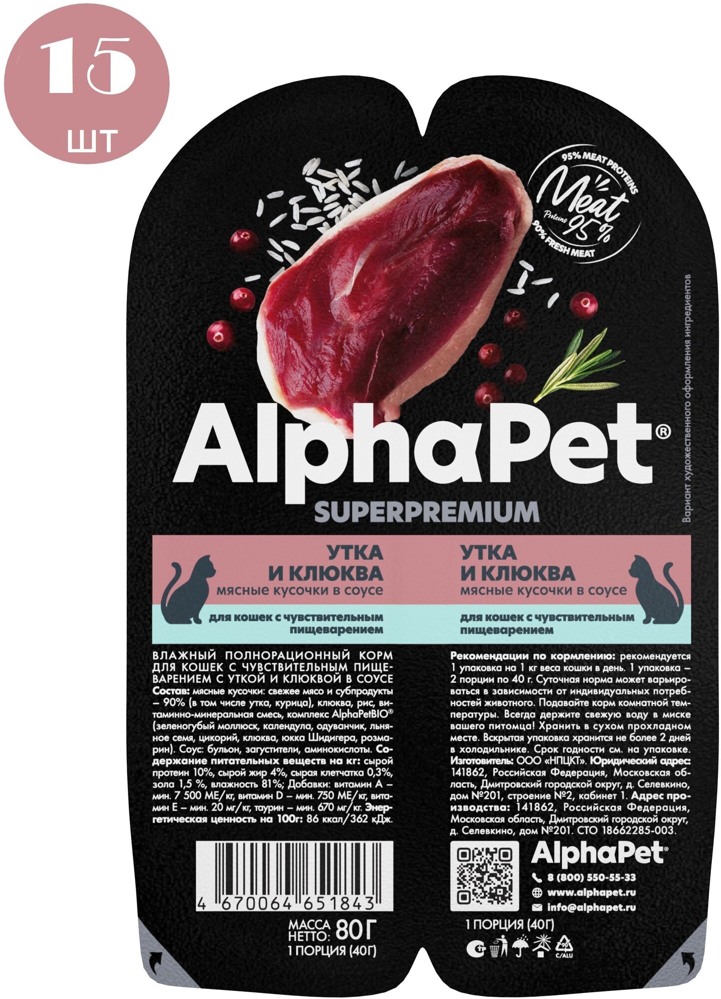AlphaPet Superpremium Влажный полнорационный корм для взрослых кошек с чувствительным пищеварением утка и клюква, 80г (Упаковка 15 блистеров)