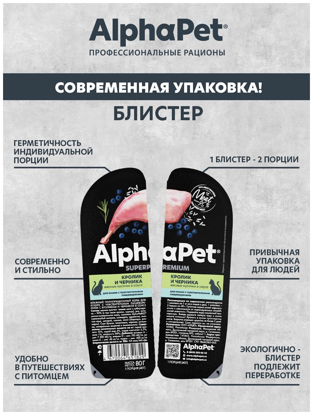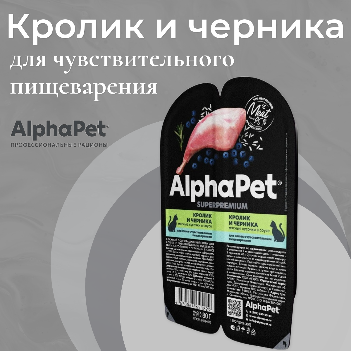 Купить Влажный корм для кошек с чувств. пищеварением AlphaPet Superpremium Кролик и черника мясные кусочки в соусе 80г (Упаковка 15 блистеров)