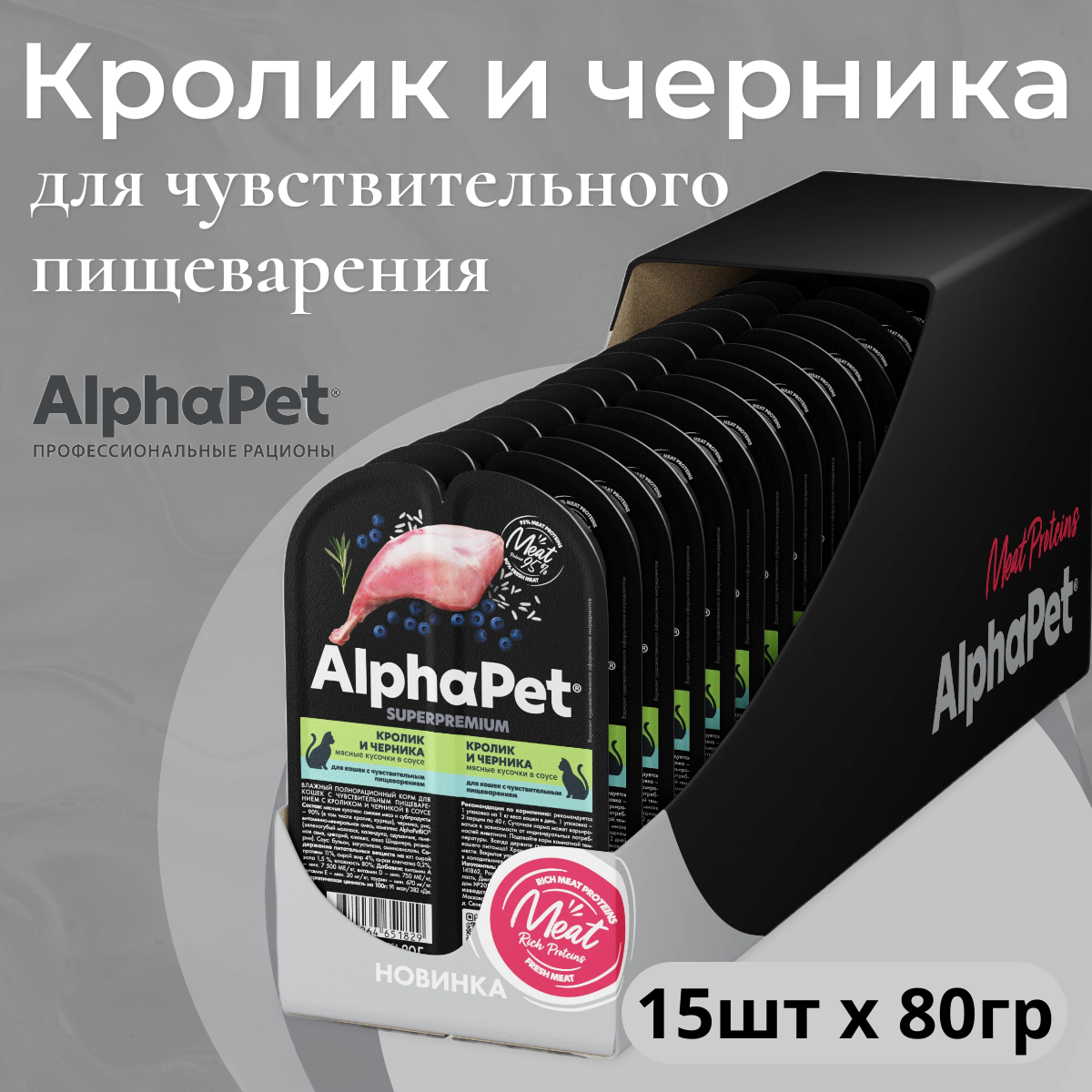 Влажный корм Alphapet Superpremium Альфа Пет для взрослых кошек с чувствительным пищеварением Кролик и черника в соусе (15 шт * 80 гр)