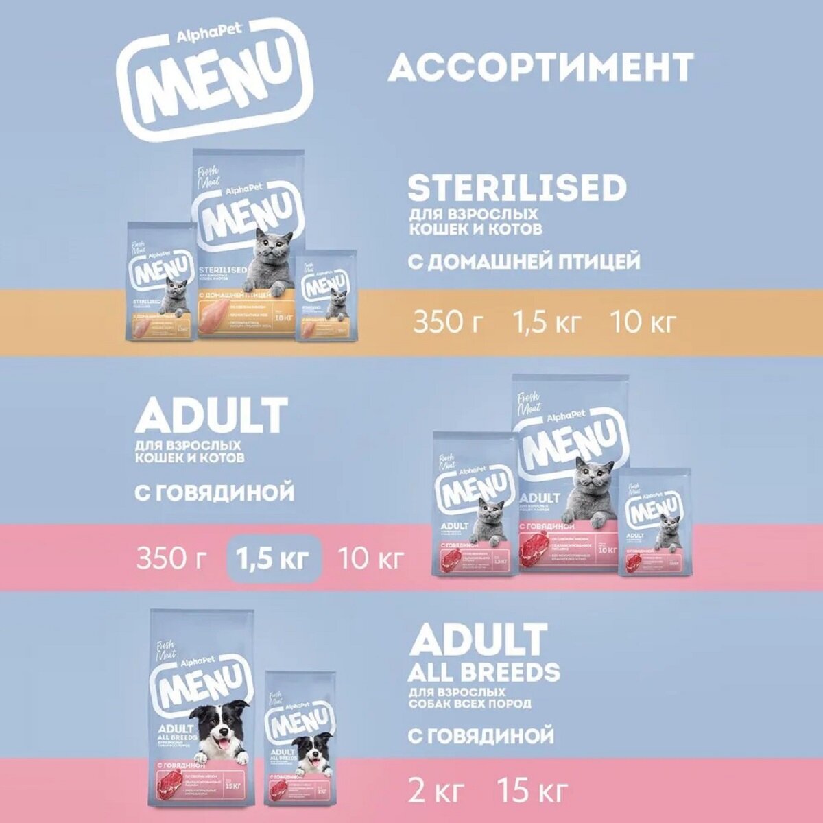 ALPHAPET MENU 1,5 кг сухой корм для взрослых кошек и котов с говядиной 3 шт